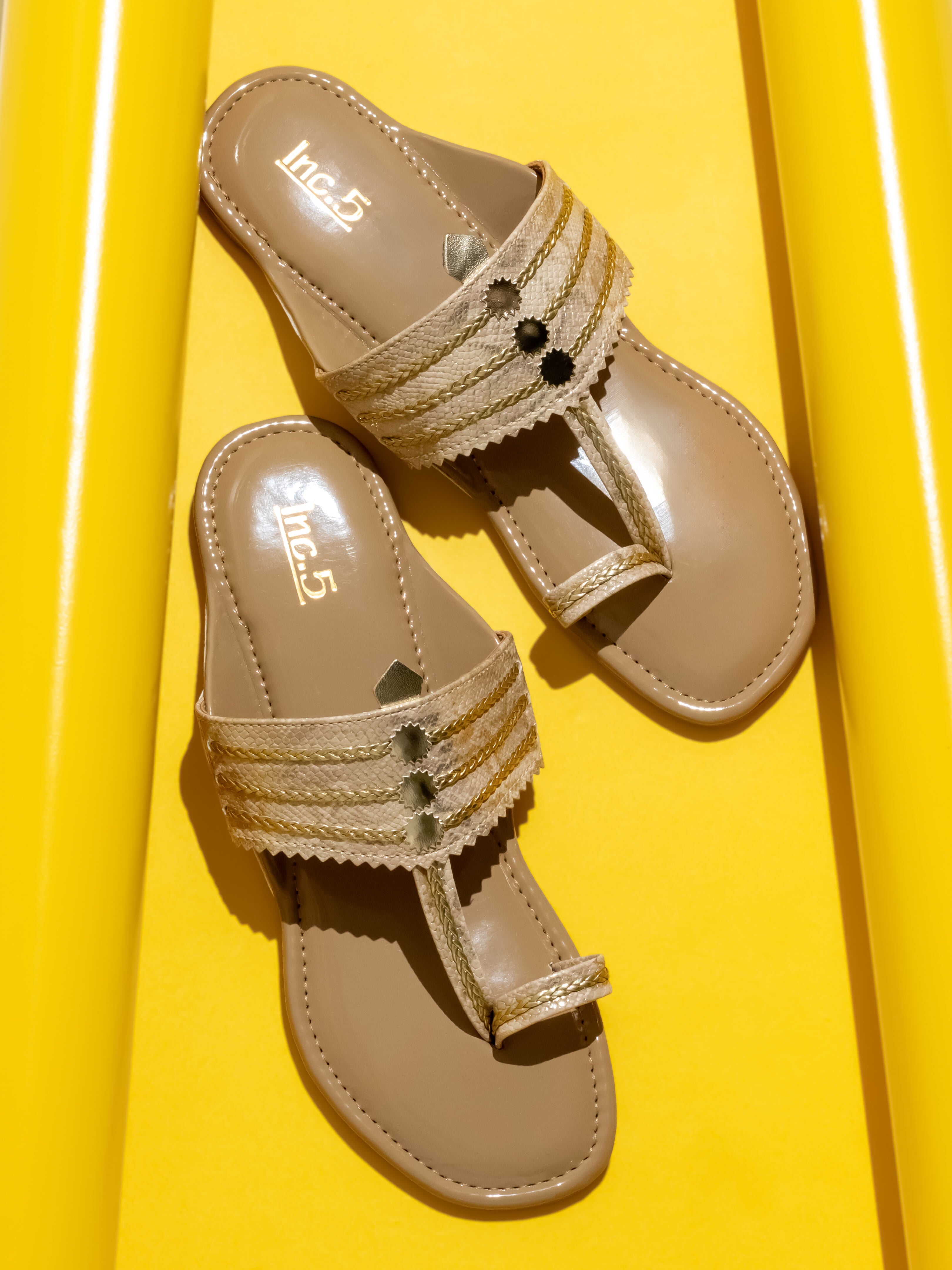Women Rose Gold Embellished Kolhapuri One Toe Flats