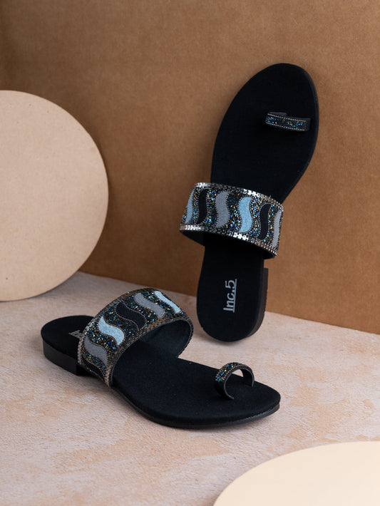 Womens Silver Ethnic Embellished Open Toe Flat Slip-On Sandals
