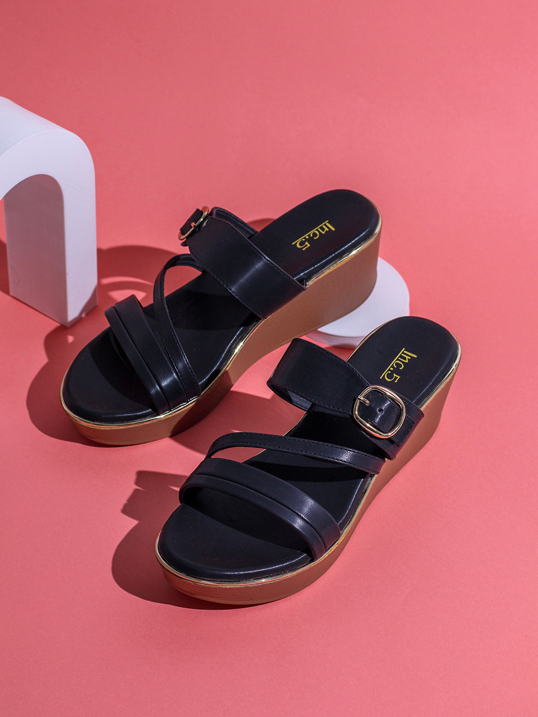 Womens Black Party Wear Solid Round Toe Wedge Heel Sandals