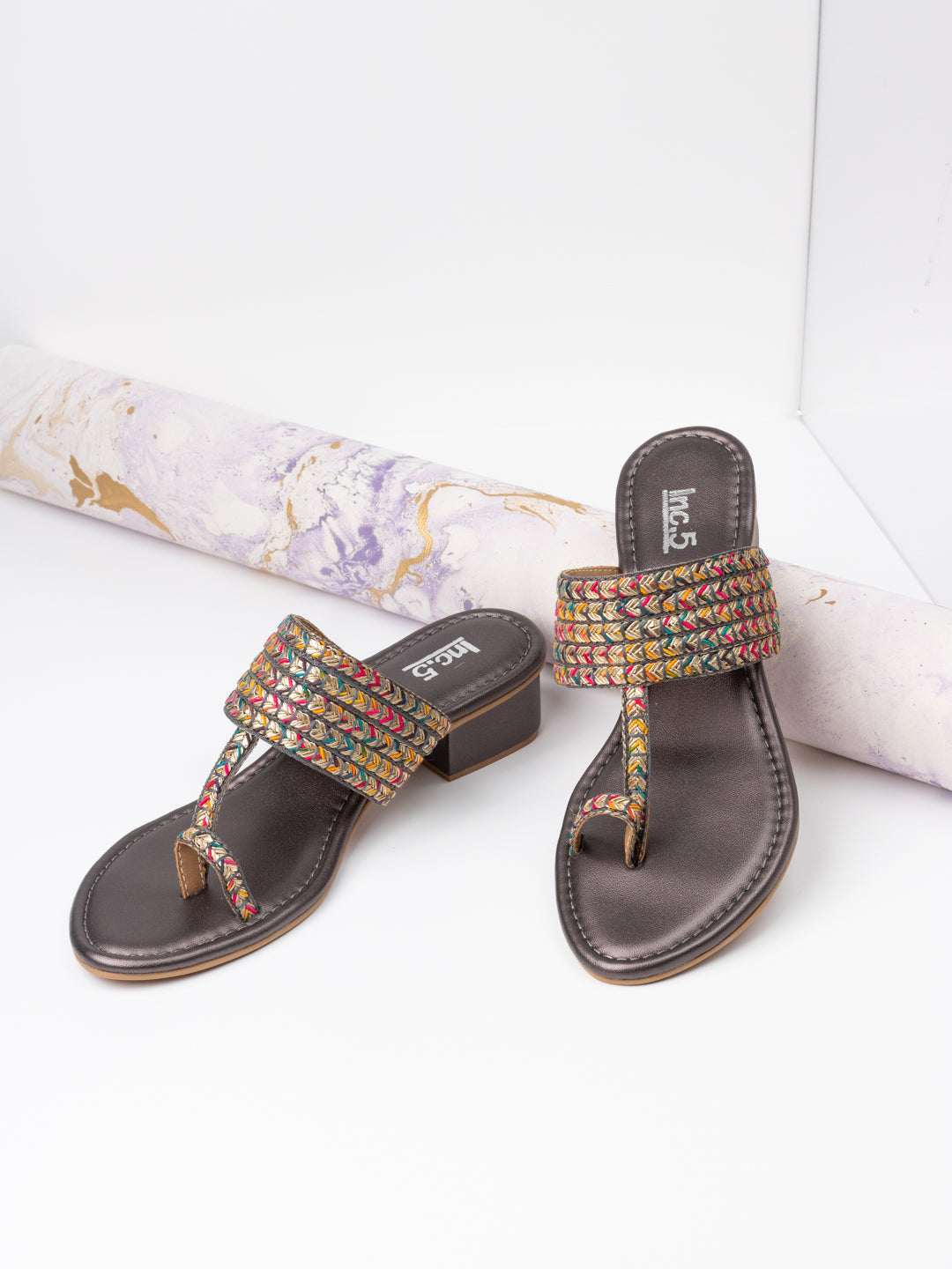 Womens Golden Party Wear Striped Square Toe Block Heel Sandals