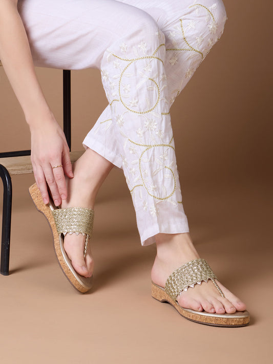 Womens Golden Ethnic Wear Embellished Round Toe Wedge Heel Sandals