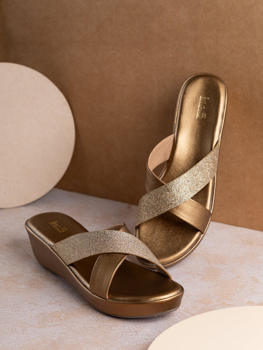 Women Golden Ethnic Solid Round Toe Wedges Sandals