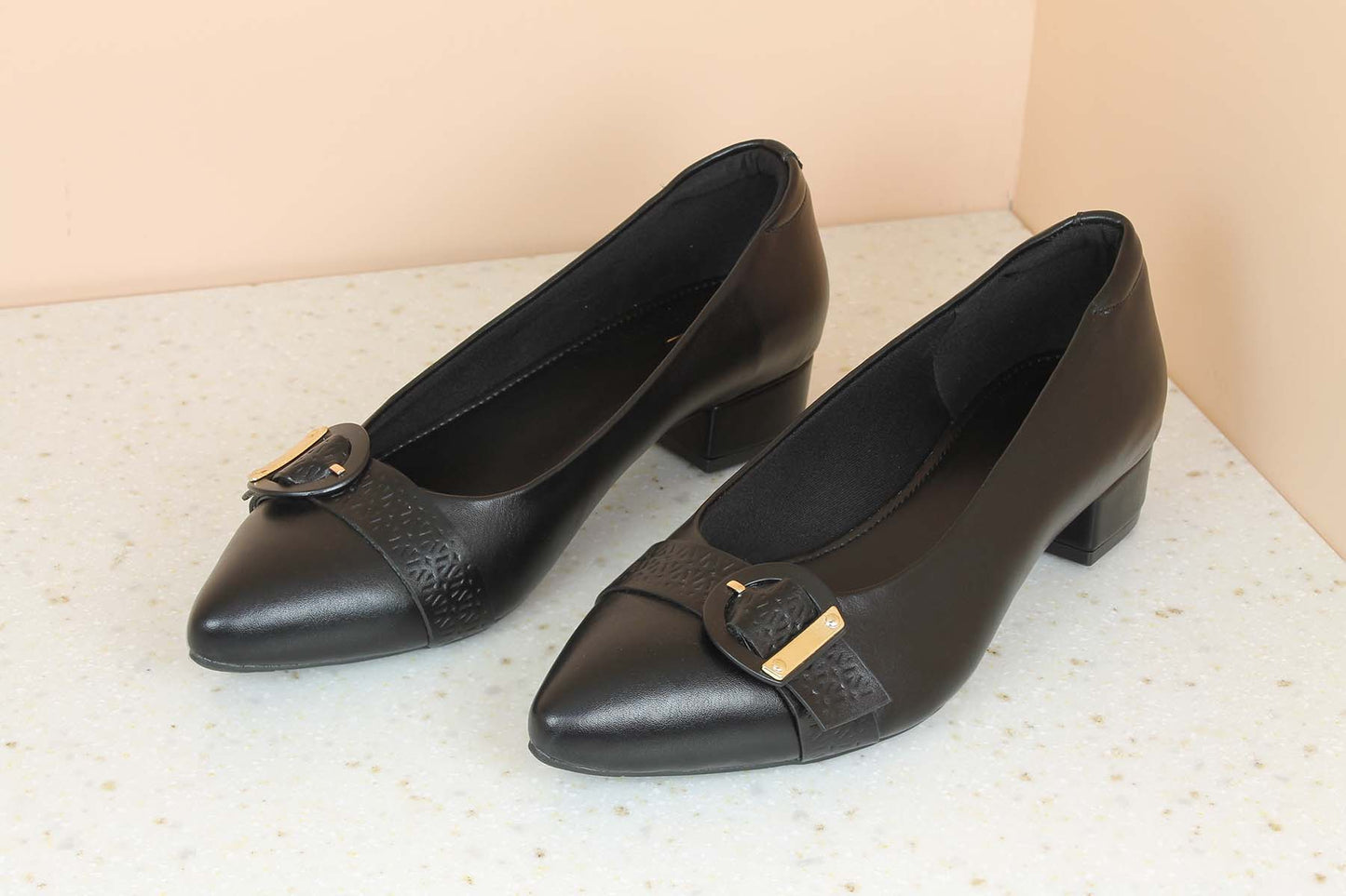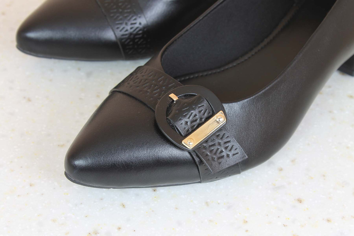Women Black Pointed Toe Block Pumps With Buckles Details