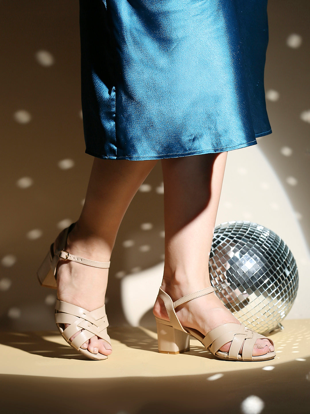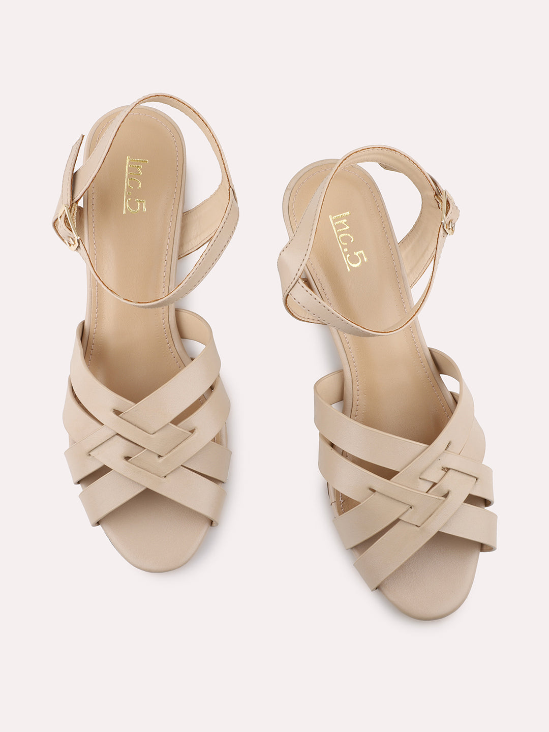 Women Beige Block Heels Peep Toes With Buckle Closure