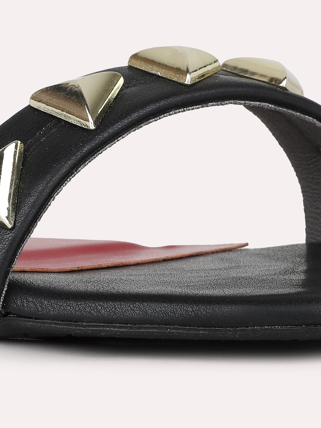 Women Black Casual Embellished Open Toe Flats Slip-On Sandals