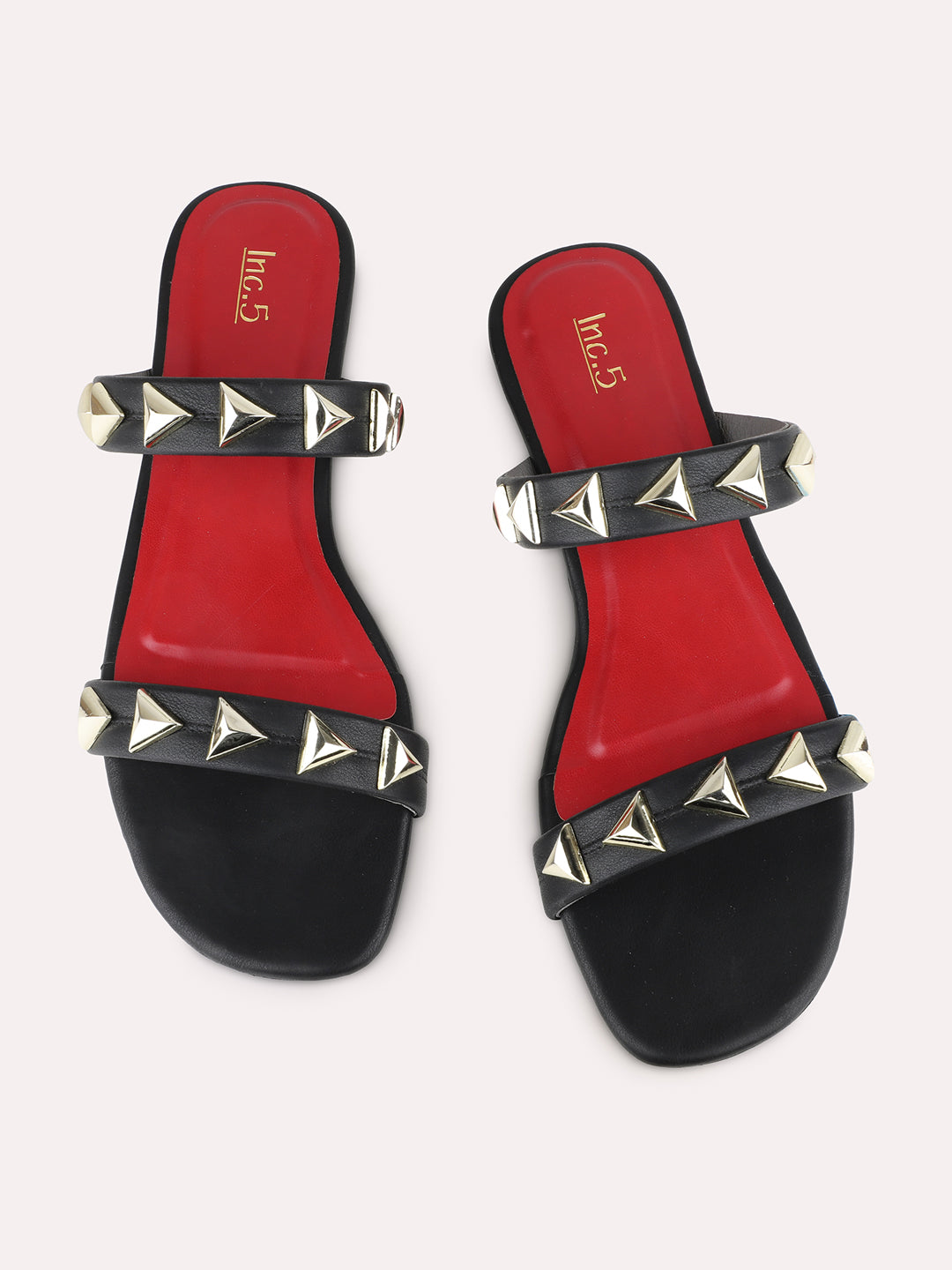 Product description:-These black embellished sandals feature an open-toe design, making them a trendy and stylish option for casual wear. The embellishments add a touch of glamour, perfect for elevating your everyday look. |
