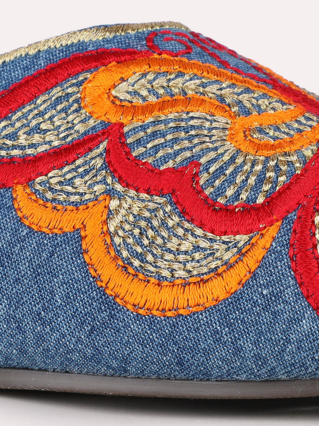 Product description:-Featuring a sleek pointed design with fun prints, these blue mules offer a bold yet casual flair. Ideal for pairing with jeans or kurtis on relaxed days. |