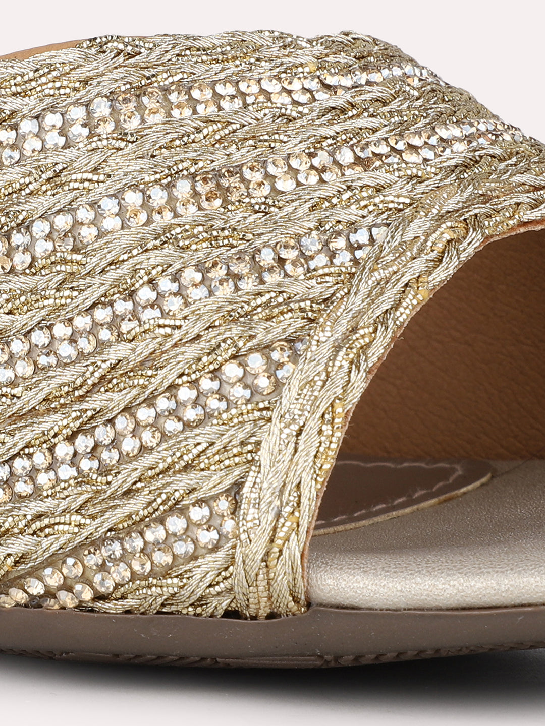 Product description:-These golden block heel sandals feature a solid round toe design and intricate embellishments, adding glamour to your party wear. Perfect for making a statement at any formal event or special occasion. |