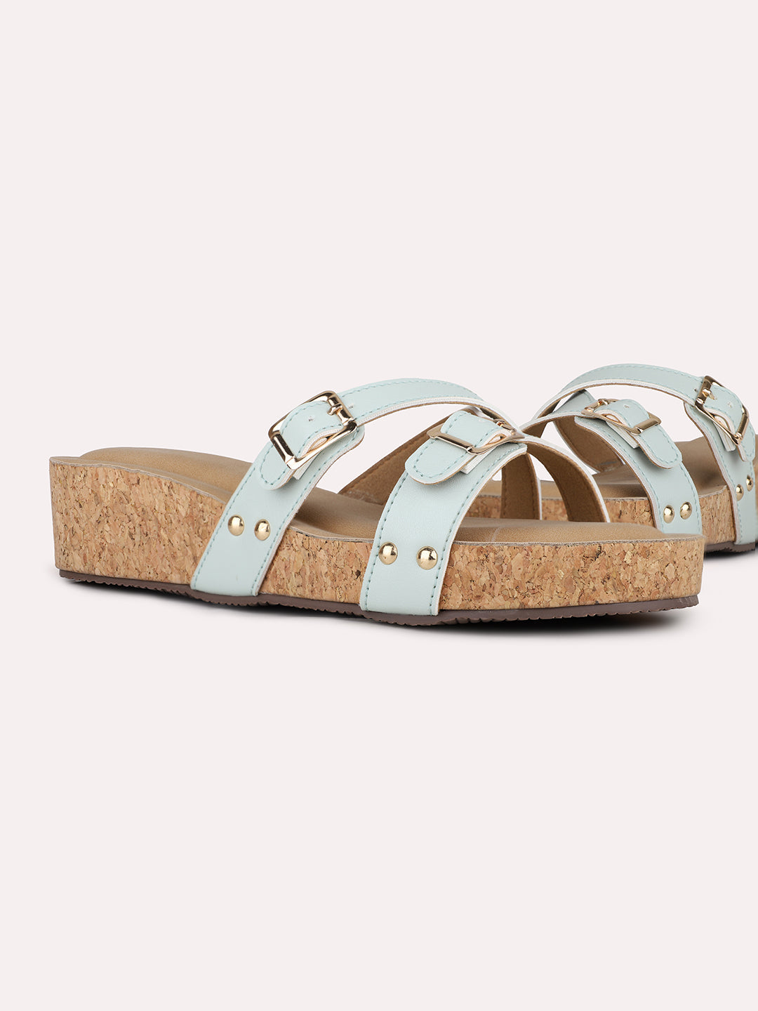 Women Green Casual Solid Open Toe Slip-On Flat Sandals