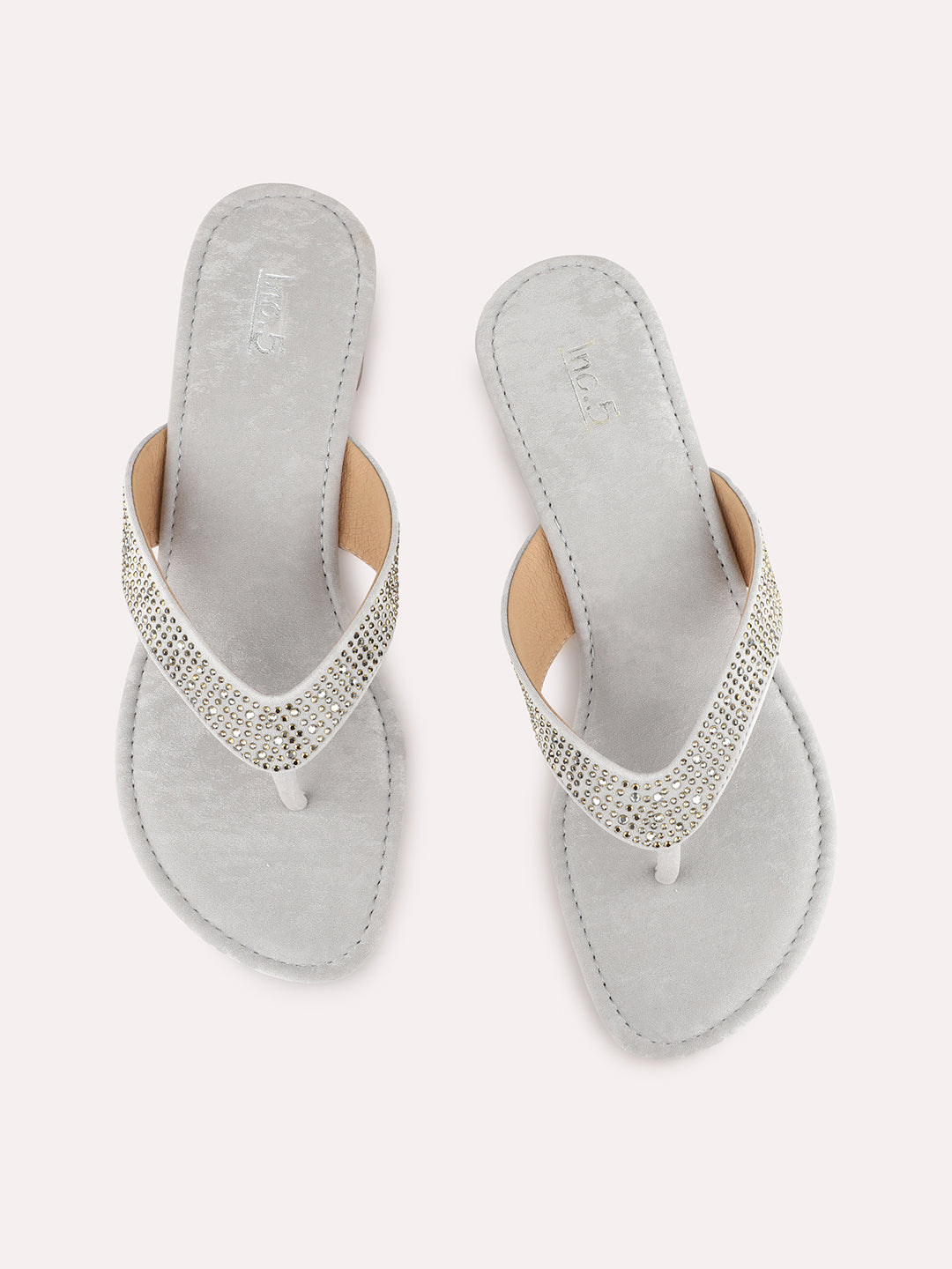 Women Grey Ethnic Embellished Round Toe Block Heel Sandals
