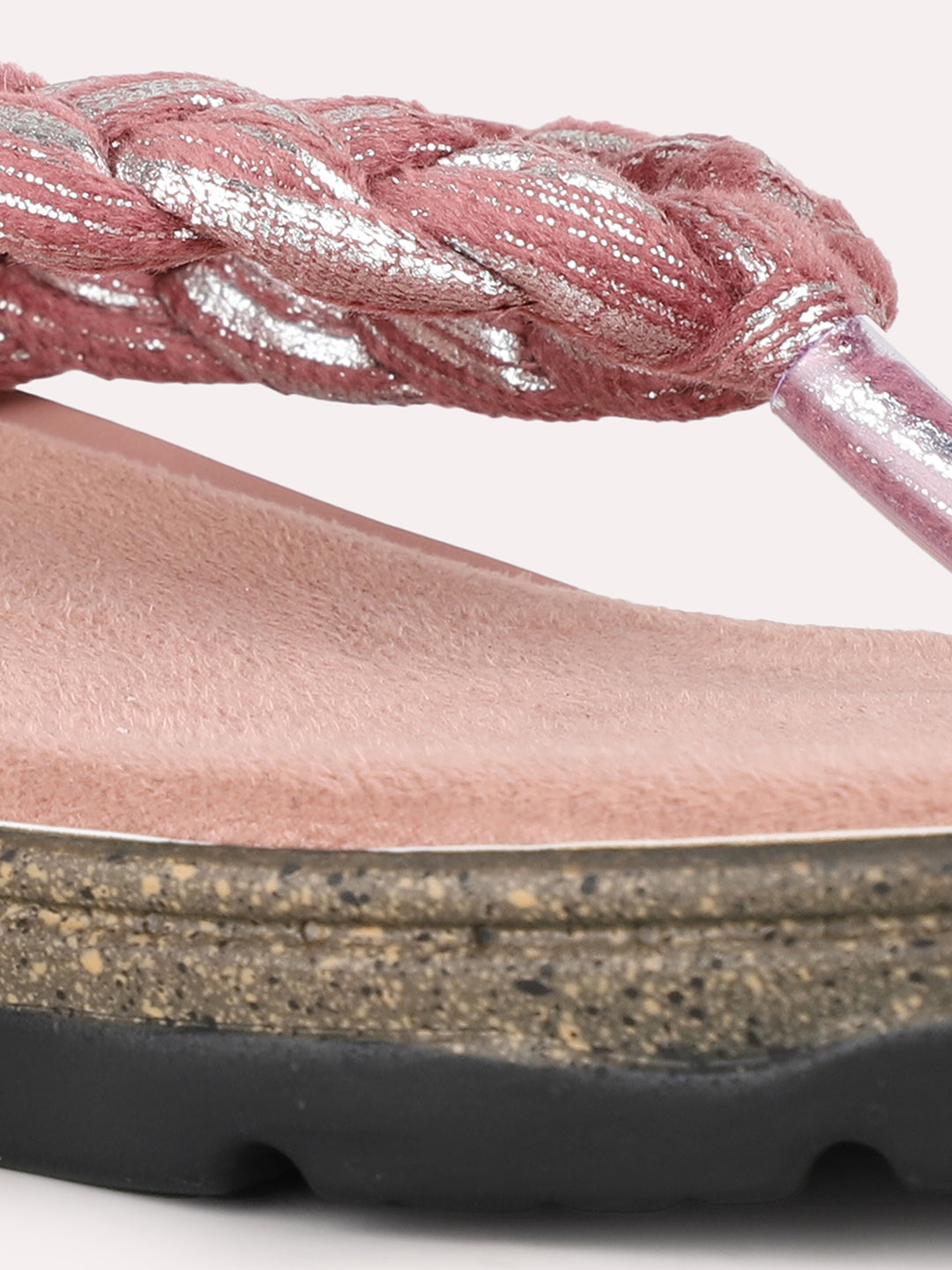 Women Peach Casual Embellished T-Strap Slip-On Flat Sandals