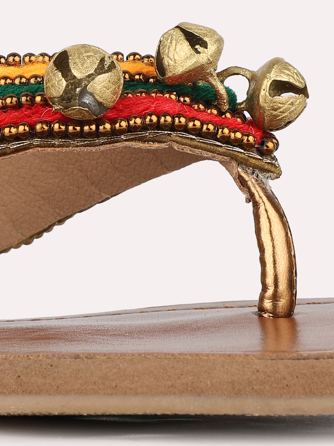 Women Red Casual Embellished T-Strap Flats Slip-On Sandals