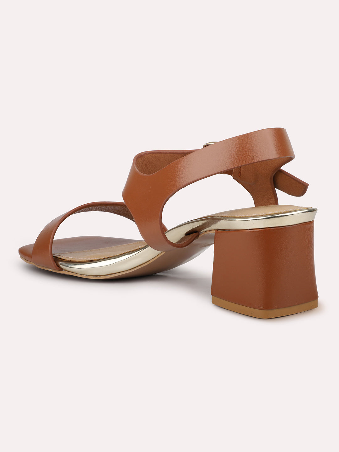Women Tan Open Toe Block Heels With Buckles