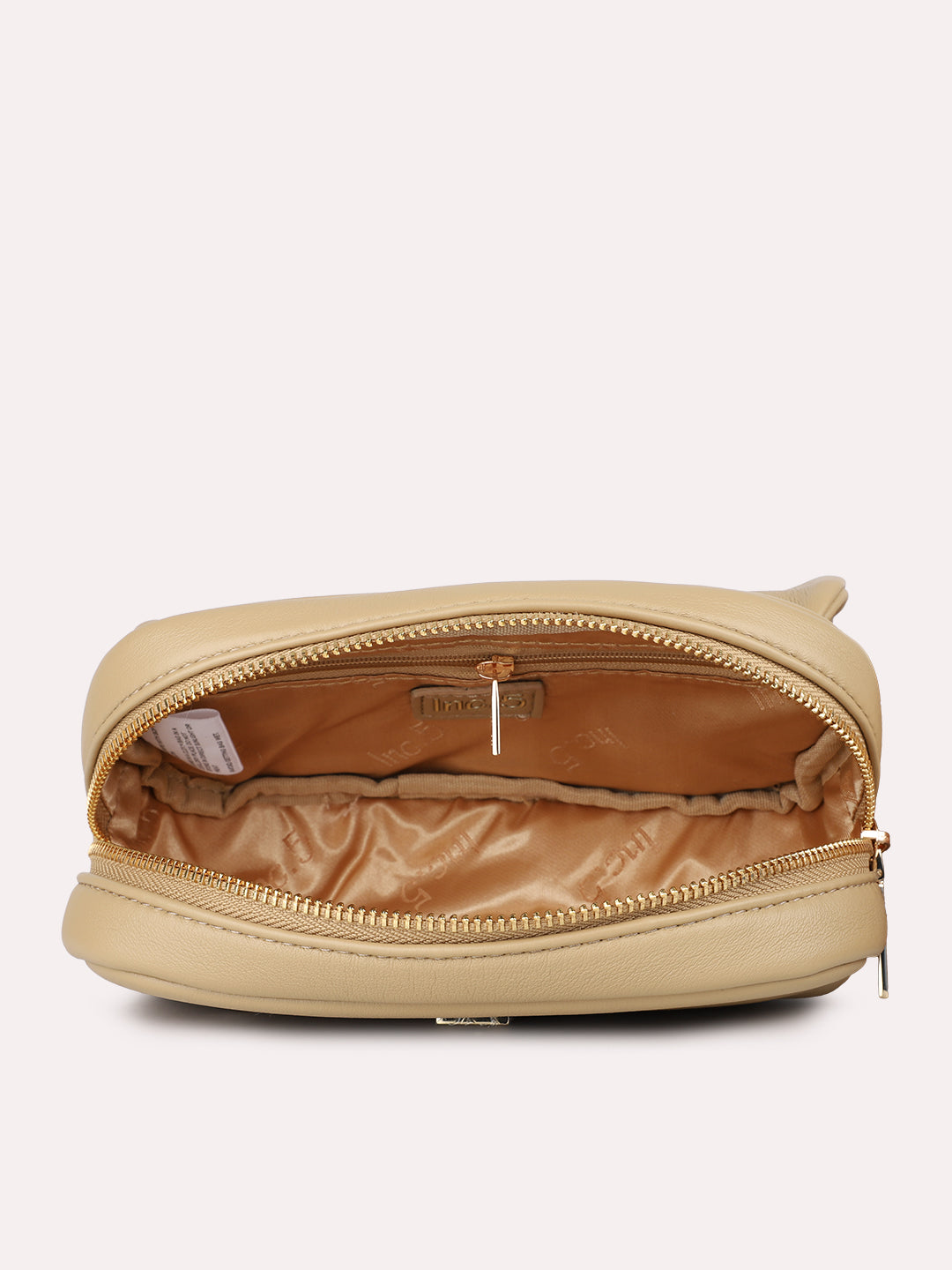 Product description:-This beige solid sling bag offers a sleek and modern look for parties. The push lock ensures secure closure while keeping your essentials organized. |