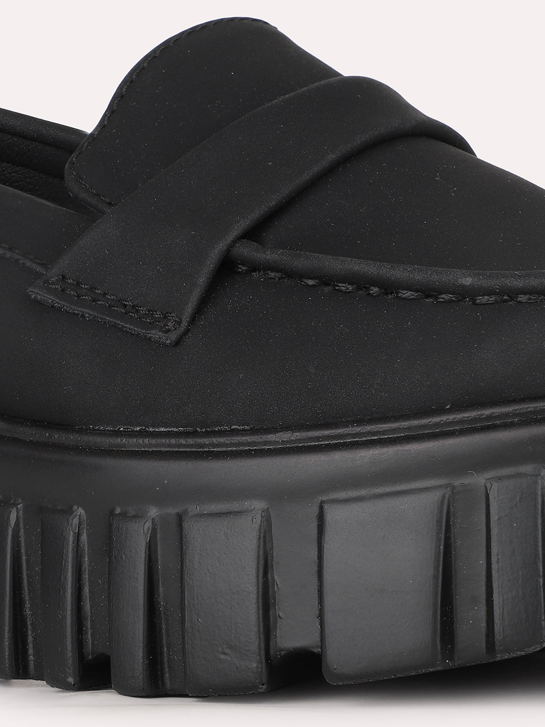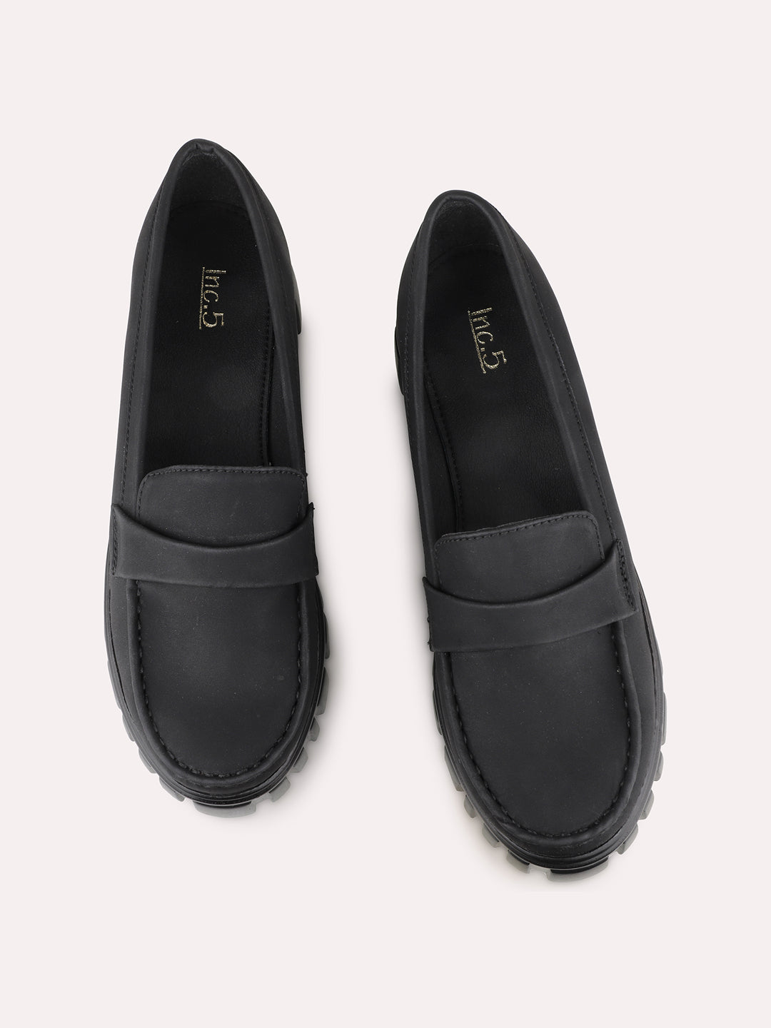Product description:- Effortlessly chic, these black slip-on shoes feature a solid pattern and round toe. Perfect for casual outings and relaxed styling. |
