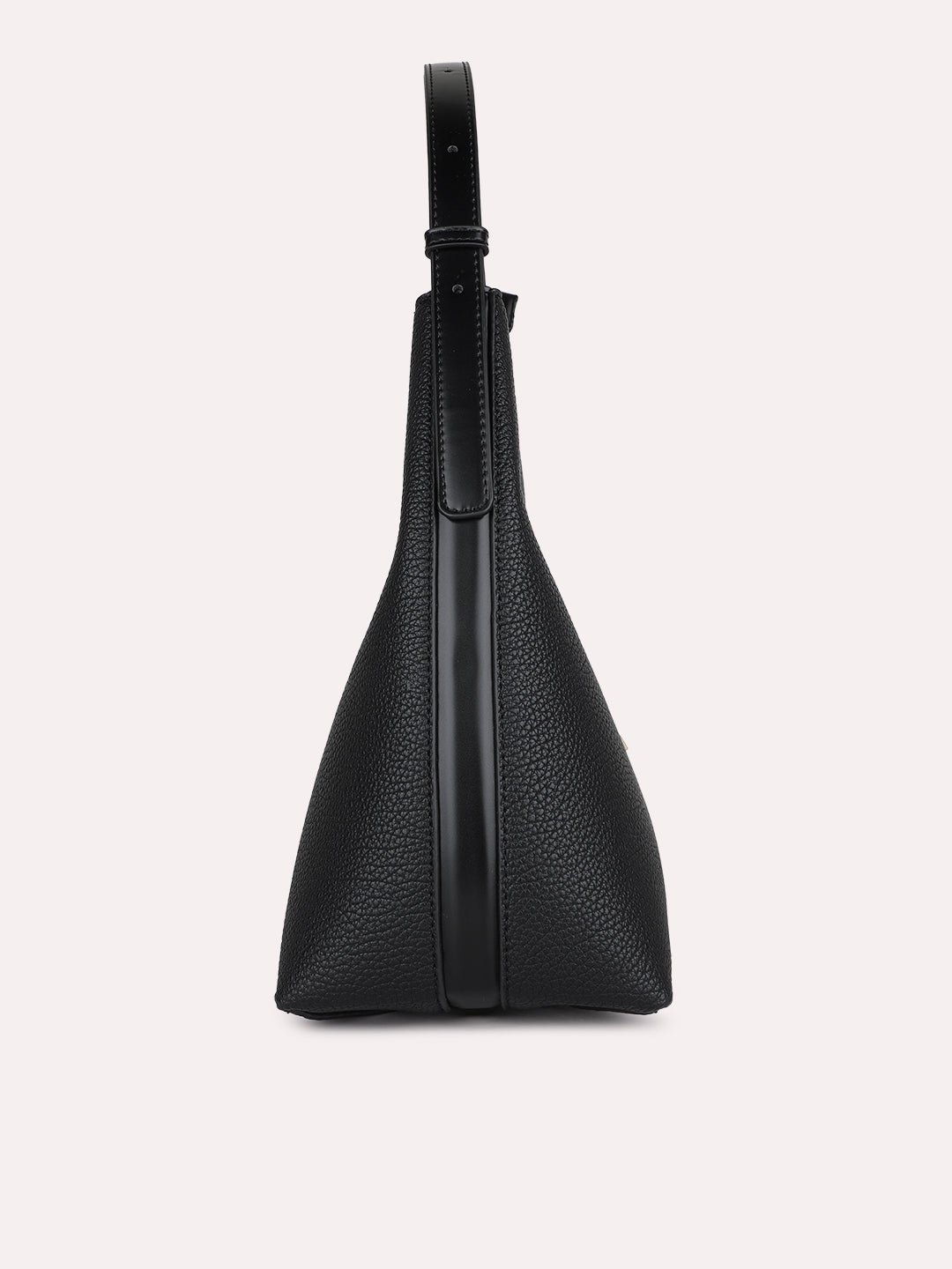 Product description:-A sleek and modern black textured shoulder bag designed for casual use. Its zip lock closure ensures safety, while its structured design adds sophistication. |