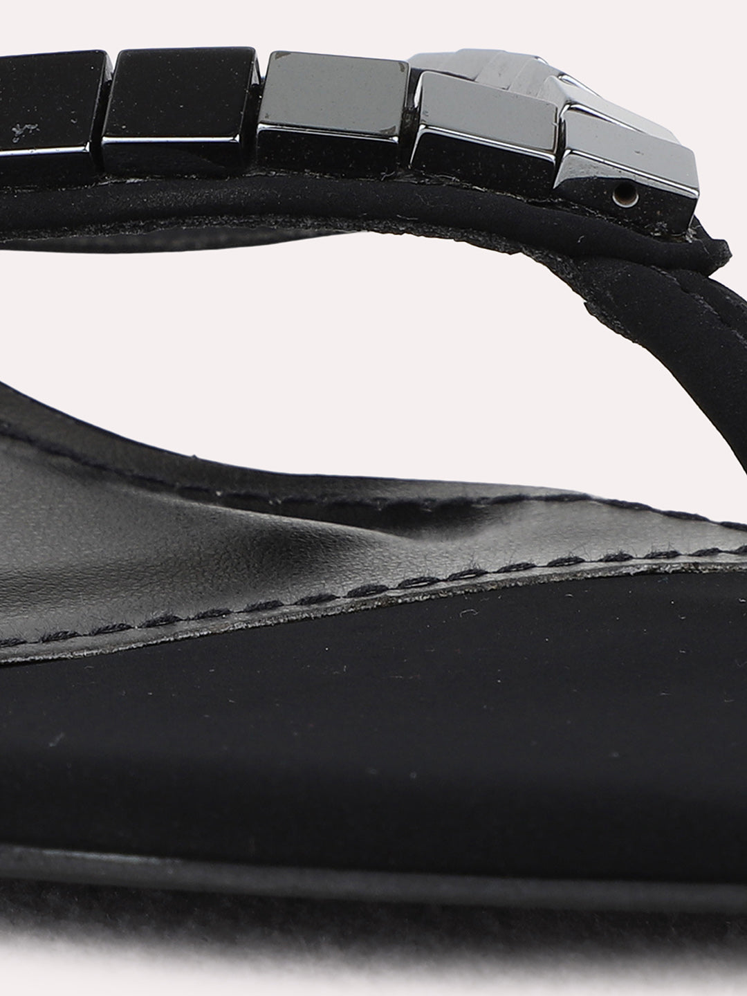 Product description:-Black kitten heel sandals with ethnic embellishments and round toe provide a blend of comfort and traditional elegance. Perfect for parties, festivals, or casual ethnic events. |
