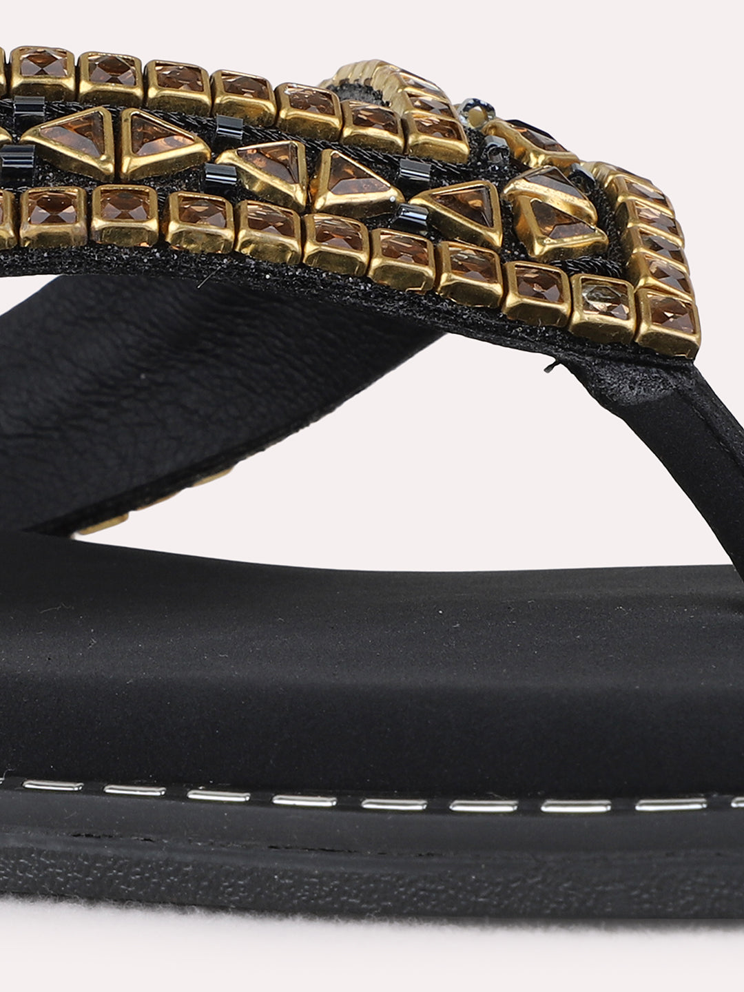 Product description:-Stylish black T-strap flat sandals featuring ethnic detailing. Perfect for traditional wear, combining comfort with classic appeal. |