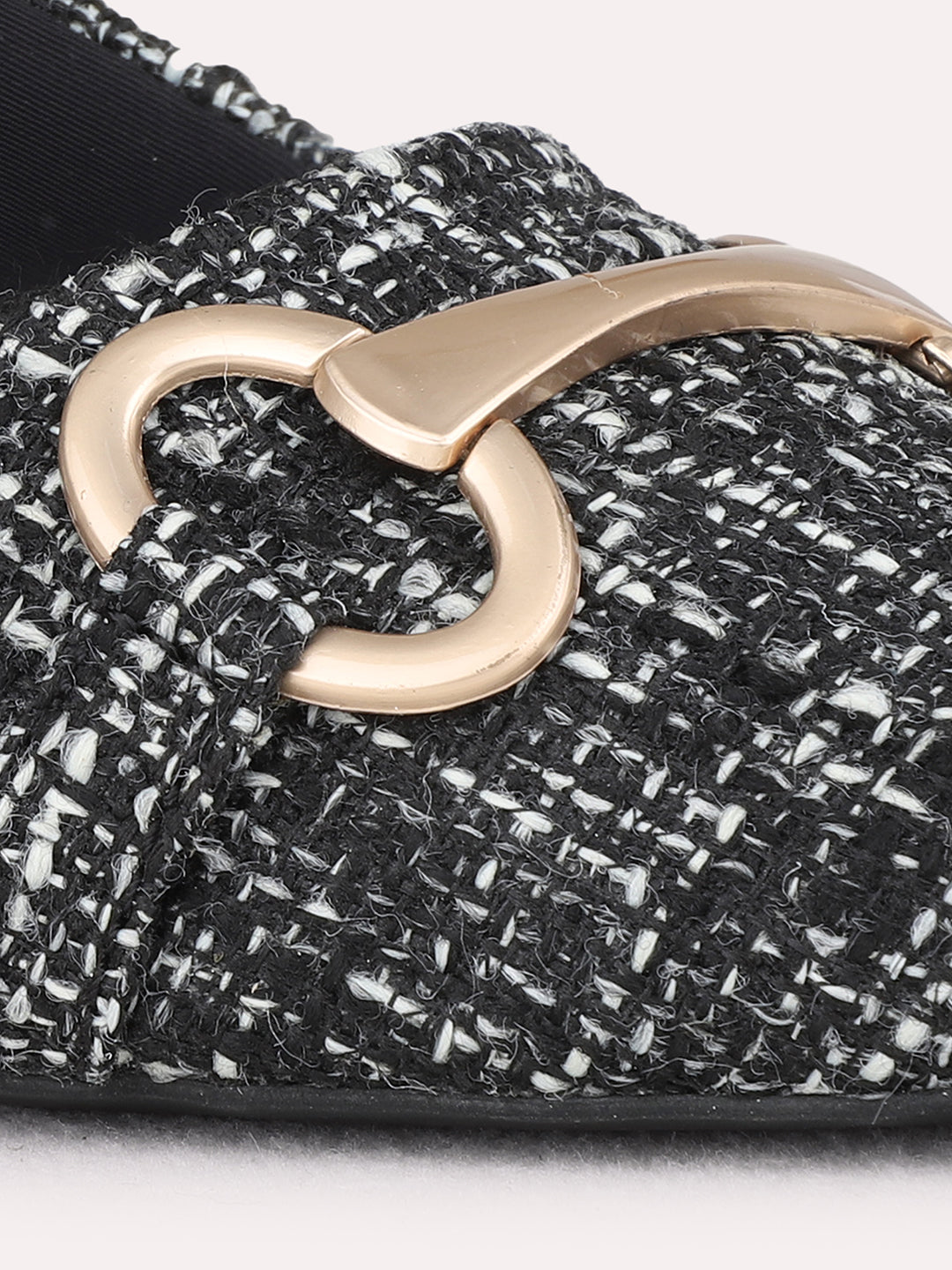 Product description:-Black party wear block heel mules with narrow toe and printed detailing. A stylish choice for festive gatherings and party outfits. |