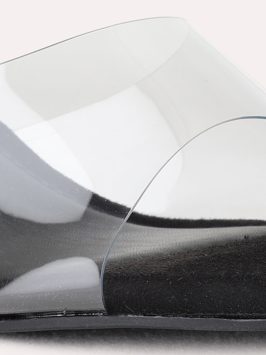 Product description:-Make a bold statement in black transparent wedges. The round toe ensures comfort, while the clear straps add a stylish twist to your party outfit. |