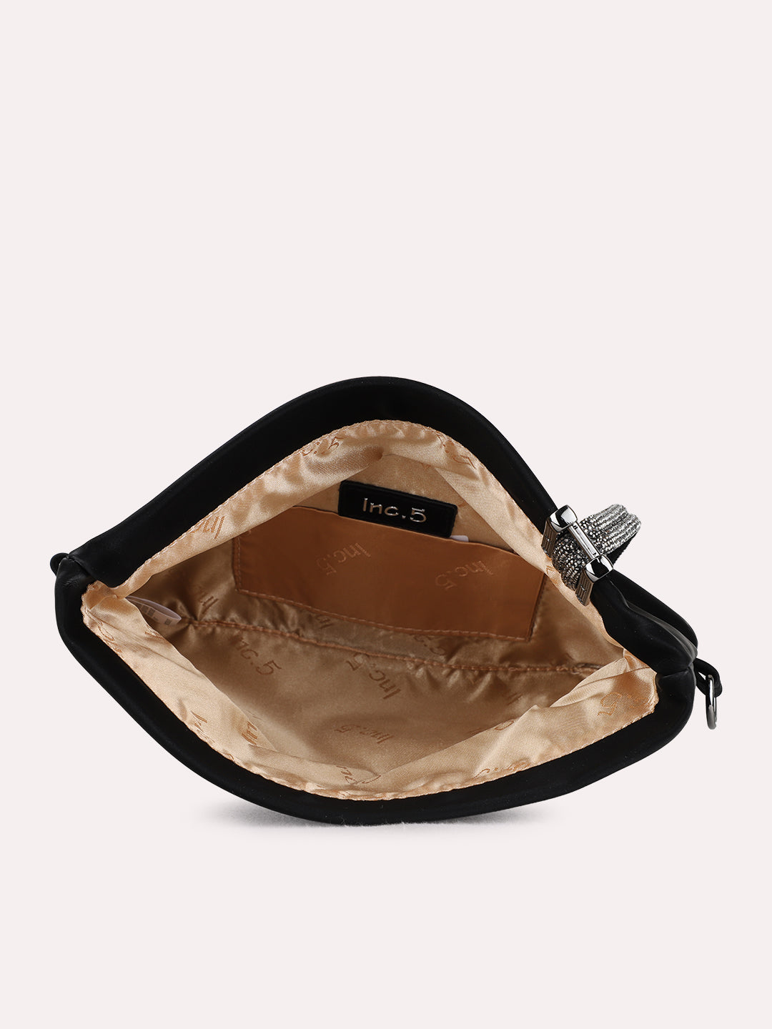 Product description:- Classic black sling bag featuring a sleek twist lock. A party-ready essential that blends timeless style with modern security. Ideal for carrying your night-out must-haves. |