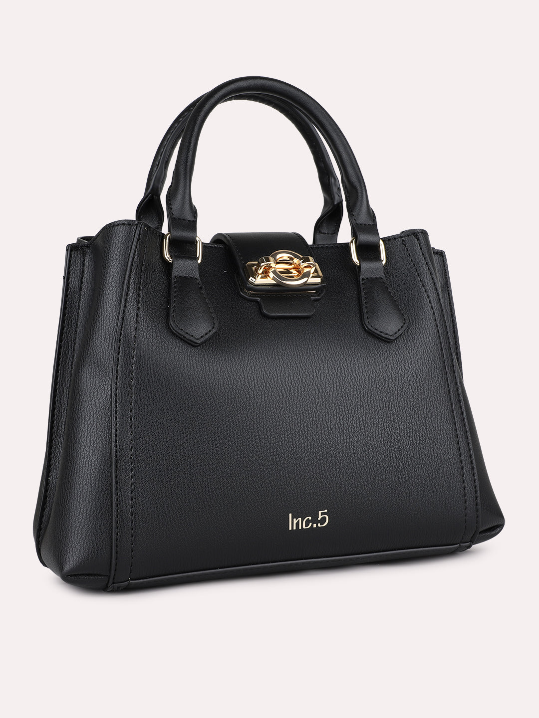 Product description:-Elegant black textured handbag designed with a twist lock closure. Adds sophistication to your outfit while offering security and style for daily or occasional use. |