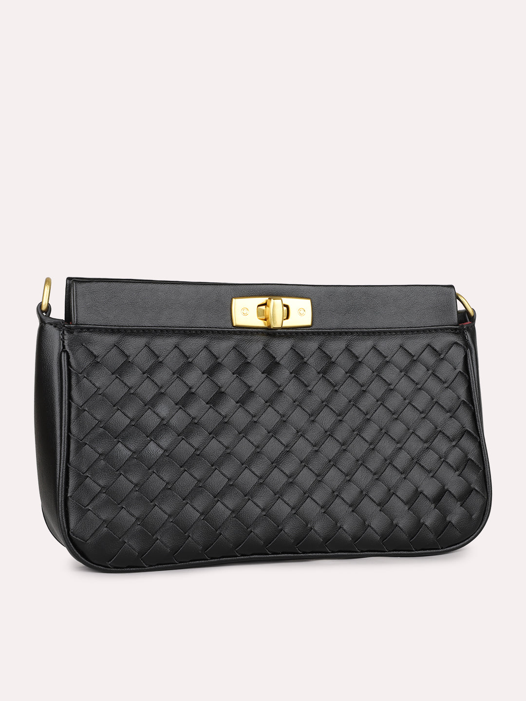 Product description:-Bold black sling bag with textured finish and twist lock. Combines sleek styling and utility for a fashion-forward everyday accessory. |