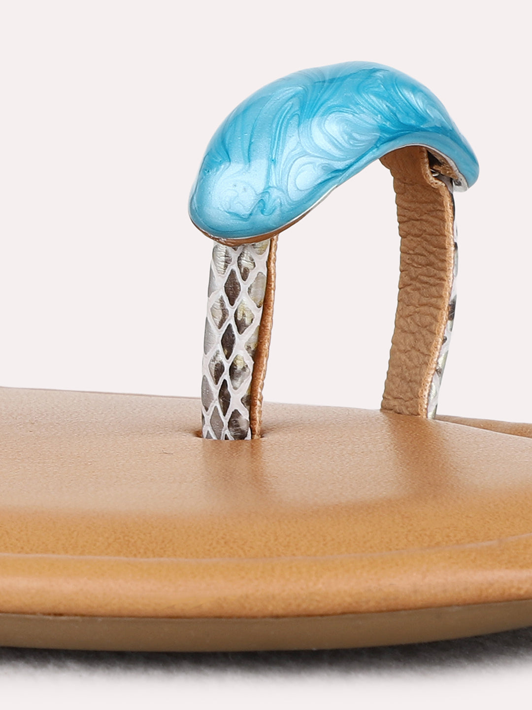 Womens Blue Casual Printed One Toe Flat Slip-on Sandals