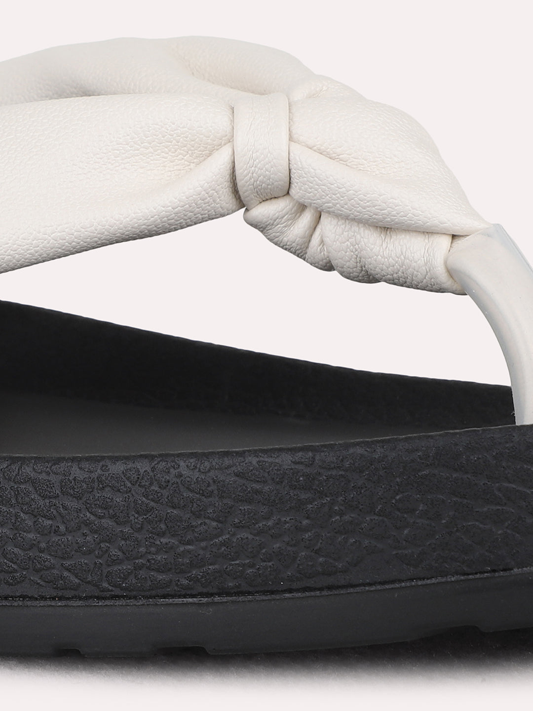 Womens Cream Casual Solid T-Strap Flat Slip-On Sandals