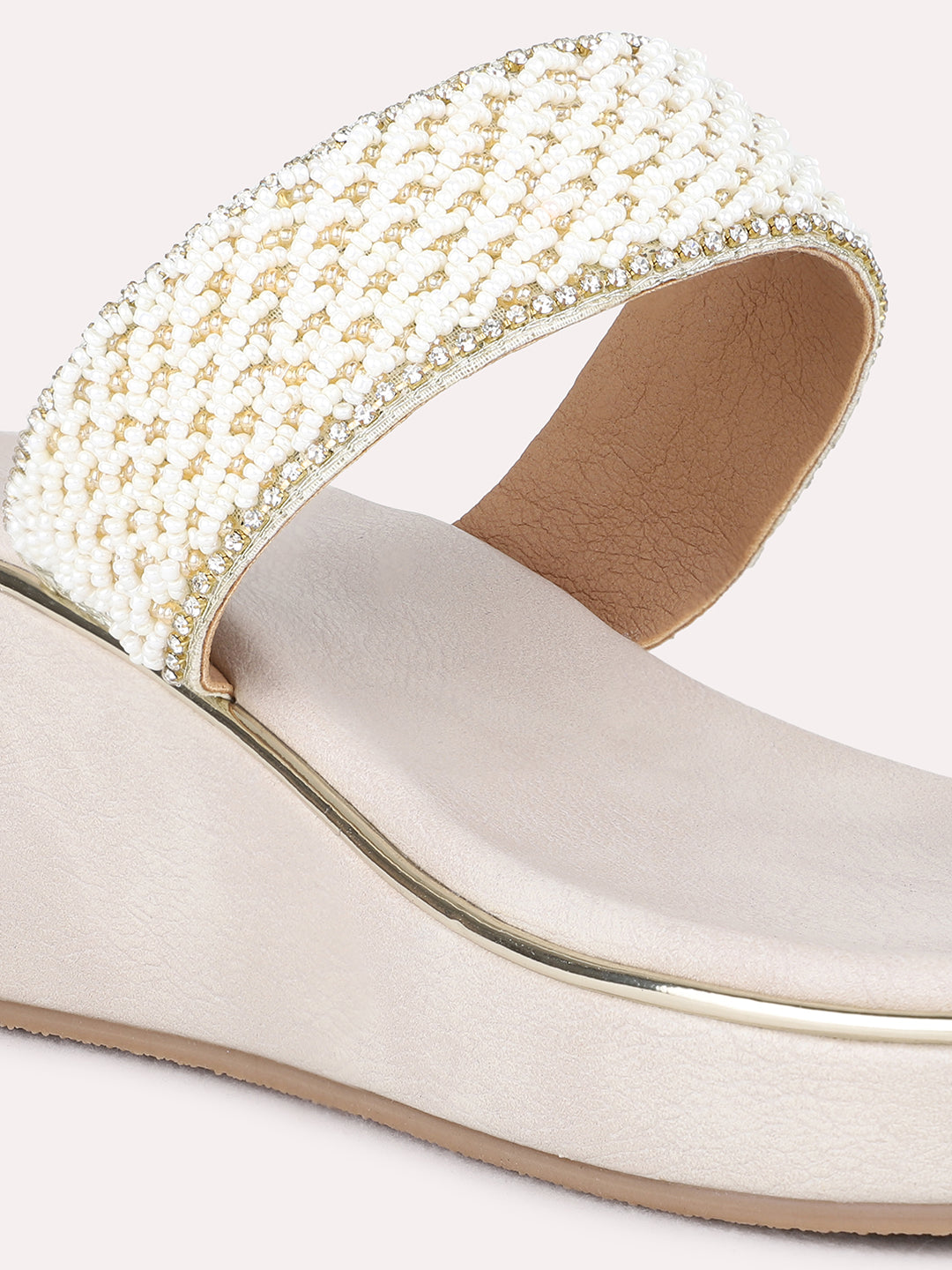 Womens Cream Party Wear Embellished Round Toe Wedge Heel Sandals
