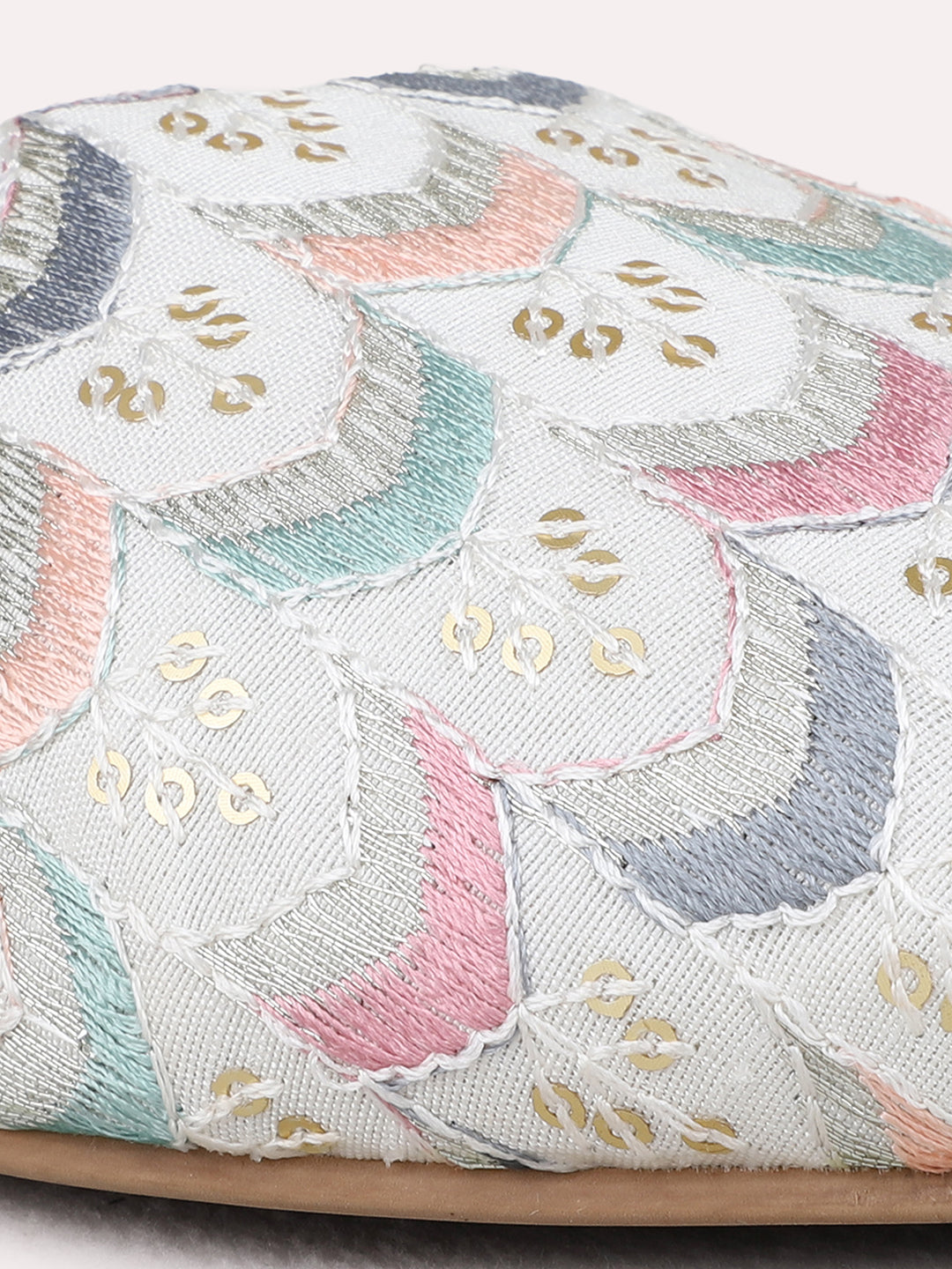 Womens Cream Party Wear Printed One Toe Flat Mules