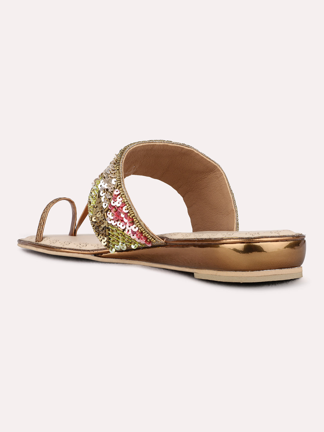 Womens Golden Ethnic Embellished One Toe Flat Slip-On Sandals