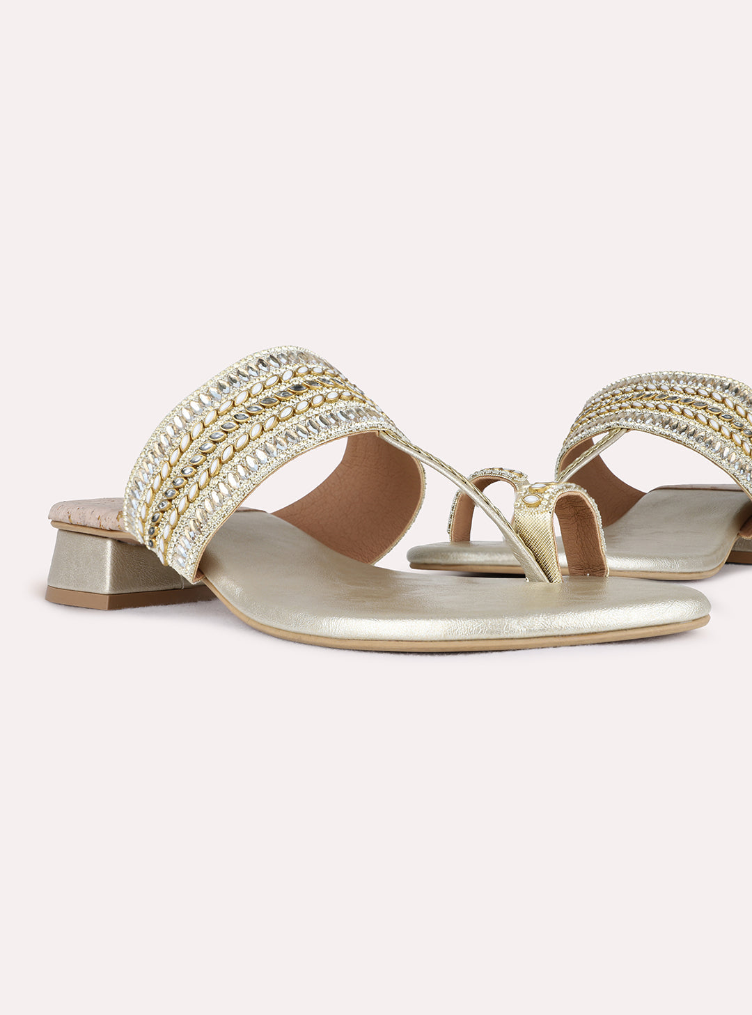 Product description:-Elegant golden block heel sandals with ethnic embellishments. Crafted for festive occasions, blending tradition with comfort. |