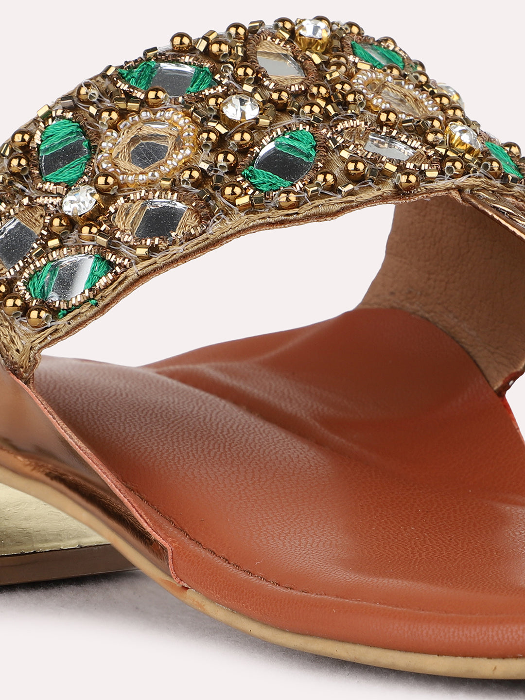 Product description:-Golden block heels with ethnic embellishments and round toe design combine stability and elegance. Perfect for weddings, festive events, and traditional celebrations. |