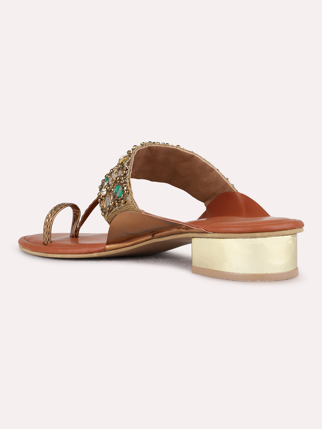 Womens Golden Ethnic Embellished Round Toe Block Heel Sandals