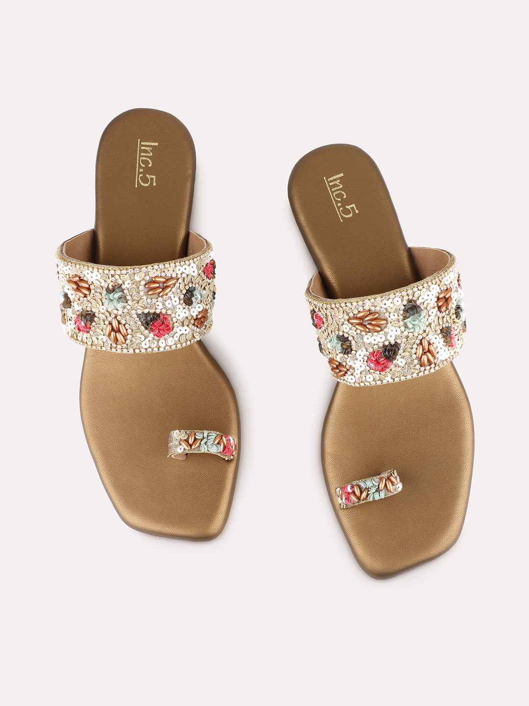 Womens Golden Ethnic Wear Embellished Square Toe Block Heel Sandals
