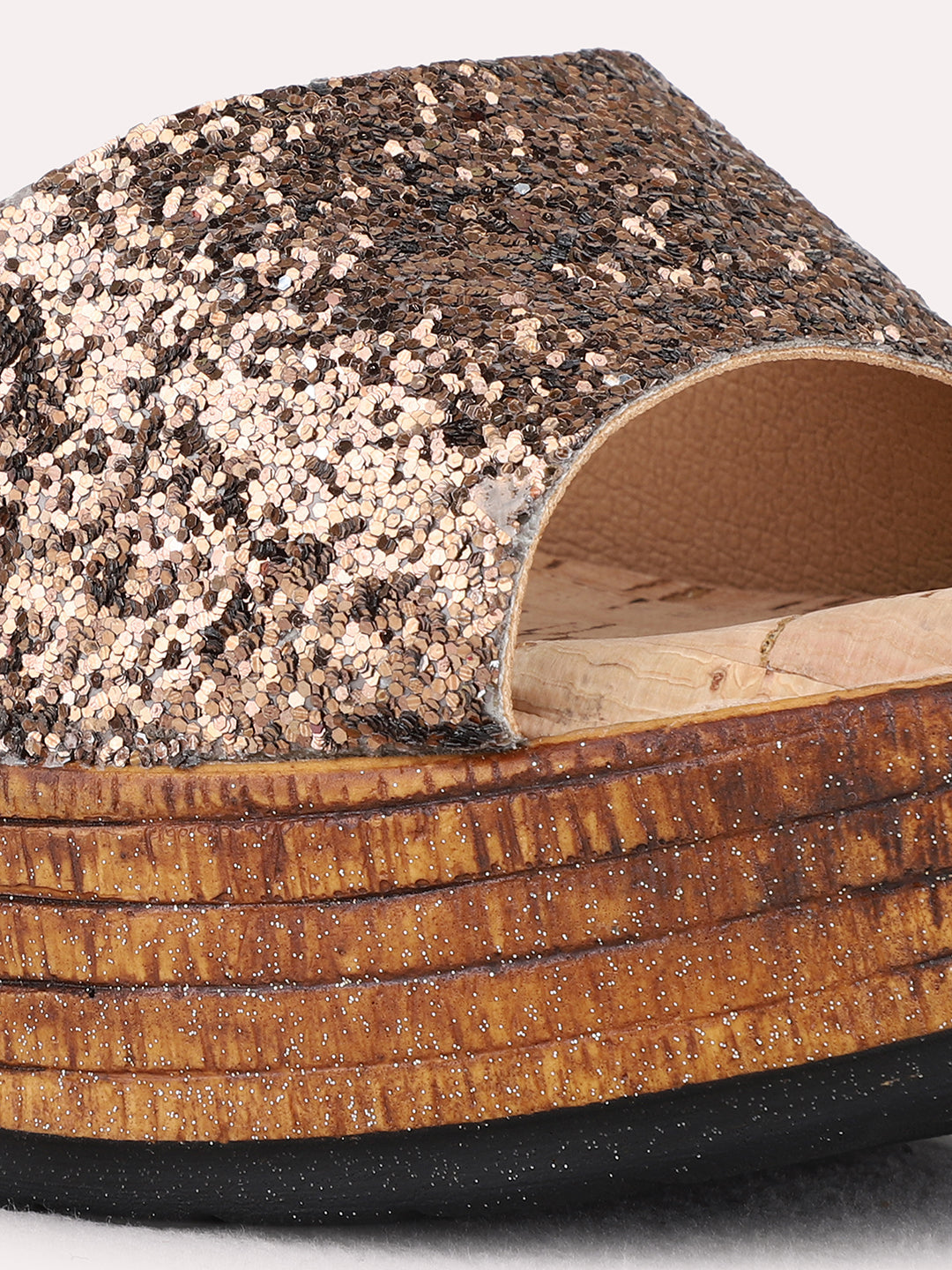 Womens Golden Ethnic Wear Textured Round Toe Wedge Heel Sandals