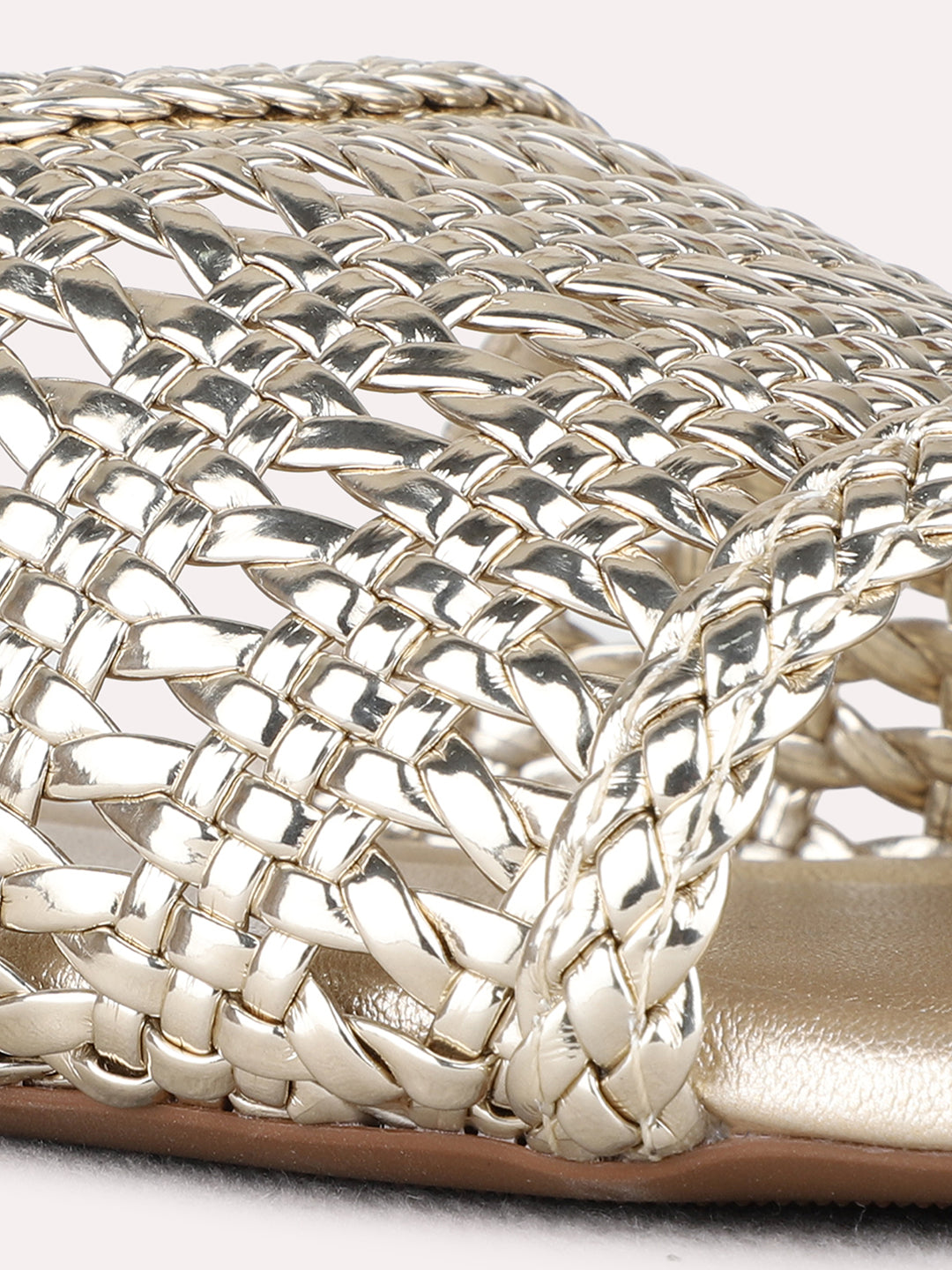 Product description:-Golden open-toe flat slip-ons with embellishments bring festive charm. Ideal for party wear, weddings, or traditional celebrations. |