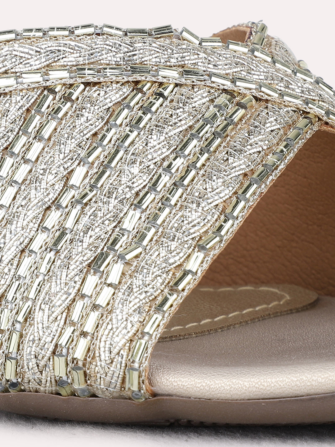 Product description:-Golden block heels with embellishments and round toe bring sparkle and elegance. Ideal for parties, weddings, or festive gatherings. |