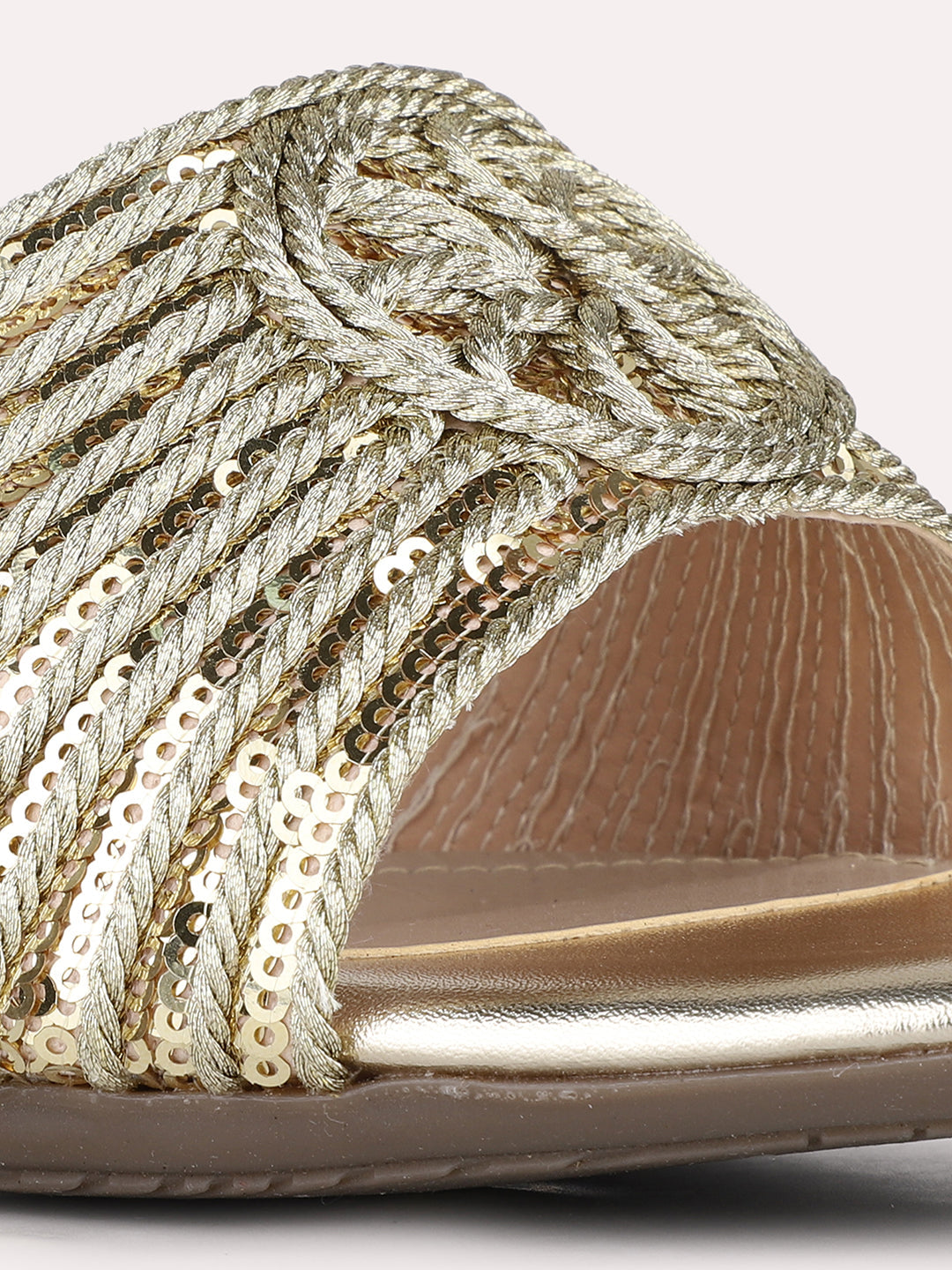 Product description:-Add a touch of sparkle to your ensemble with these golden embellished kitten heel sandals. The round toe ensures comfort while maintaining a stylish appeal. |