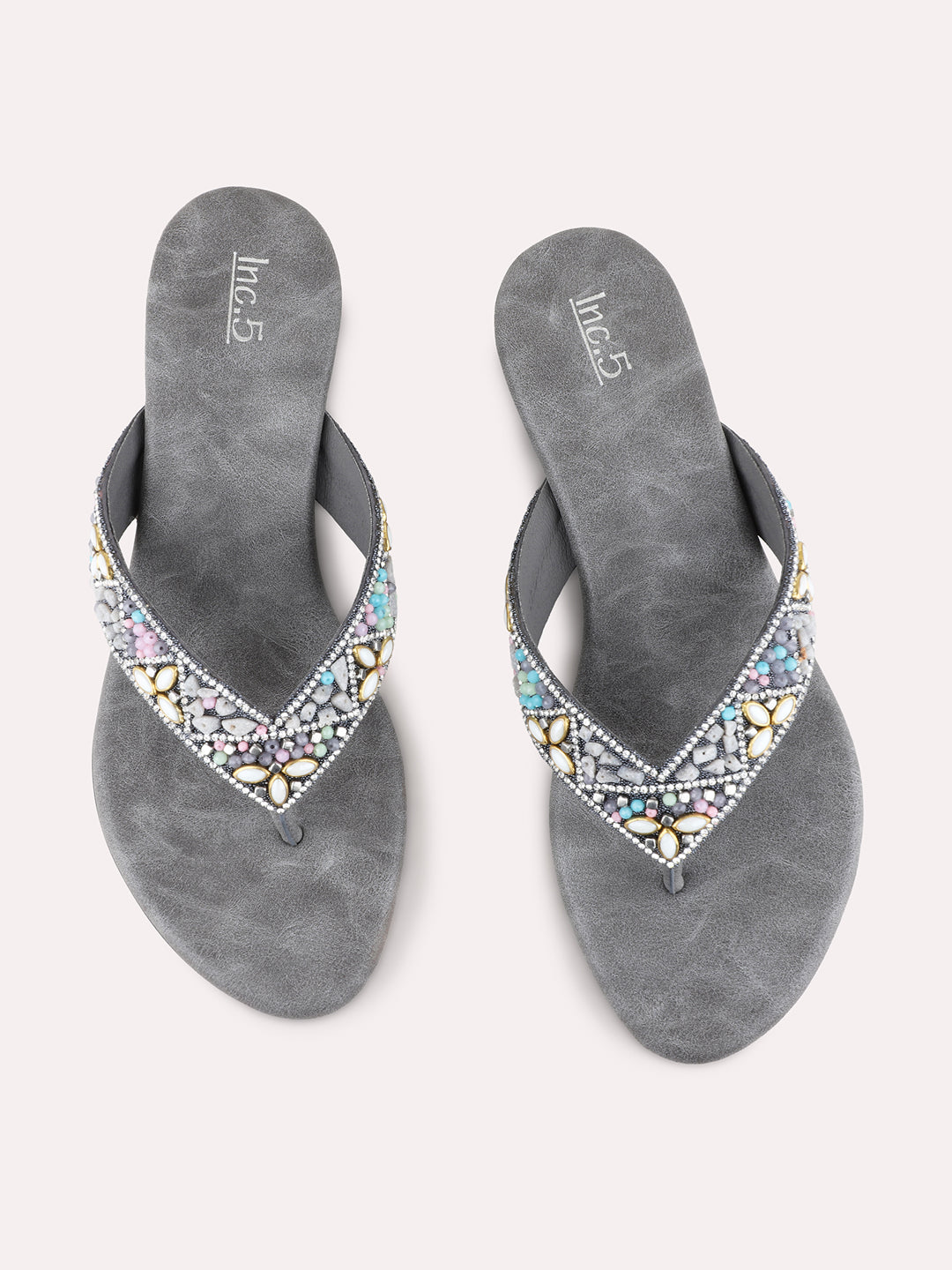 Product description:-Subtle grey ethnic embellished block heels. Adorned with detailing and a round toe on a stable block heel, these offer comfortable elevation, perfect for sophisticated traditional styling. |