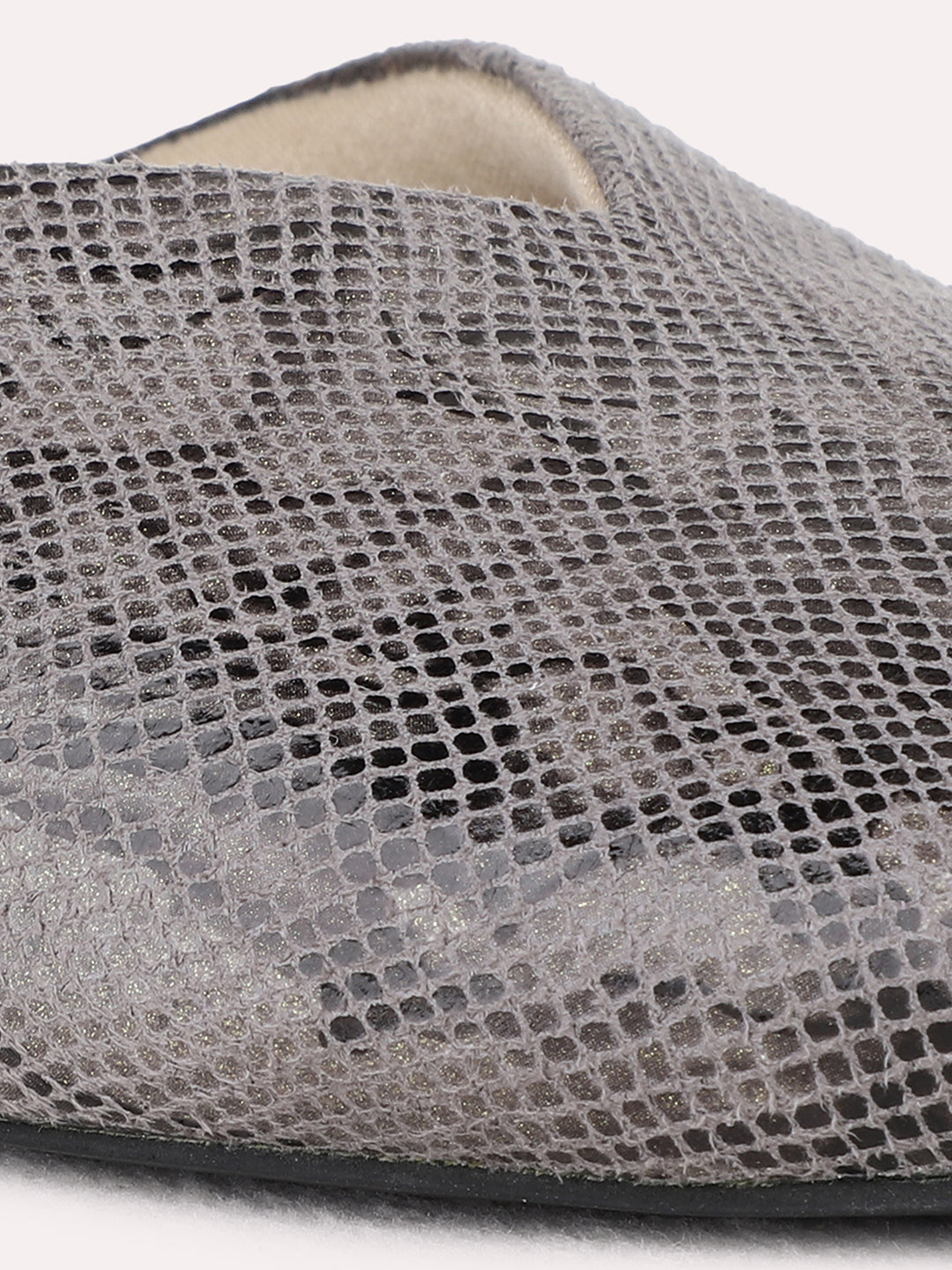 Product description:-Chic Grey mules with a comfortable block heel. The printed pattern and elegant pointed toe make them a fashionable and stable choice for sophisticated party wear. |
