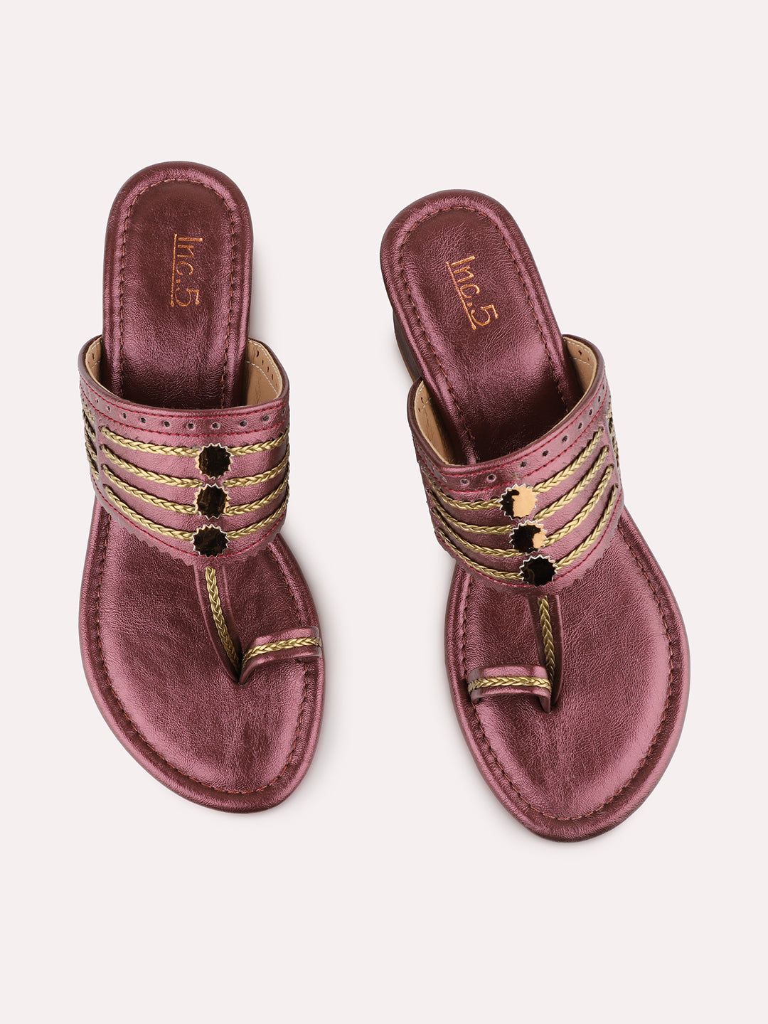 Womens Maroon Ethnic Wear Embellished Round Toe Block Heel Sandals