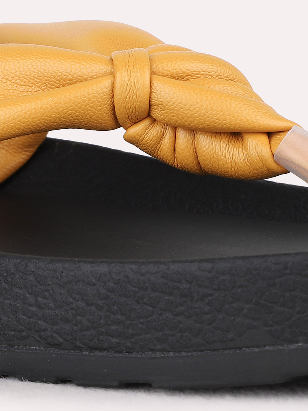 Womens Mustard Casual Solid T-Strap Flat Slip-On Sandals