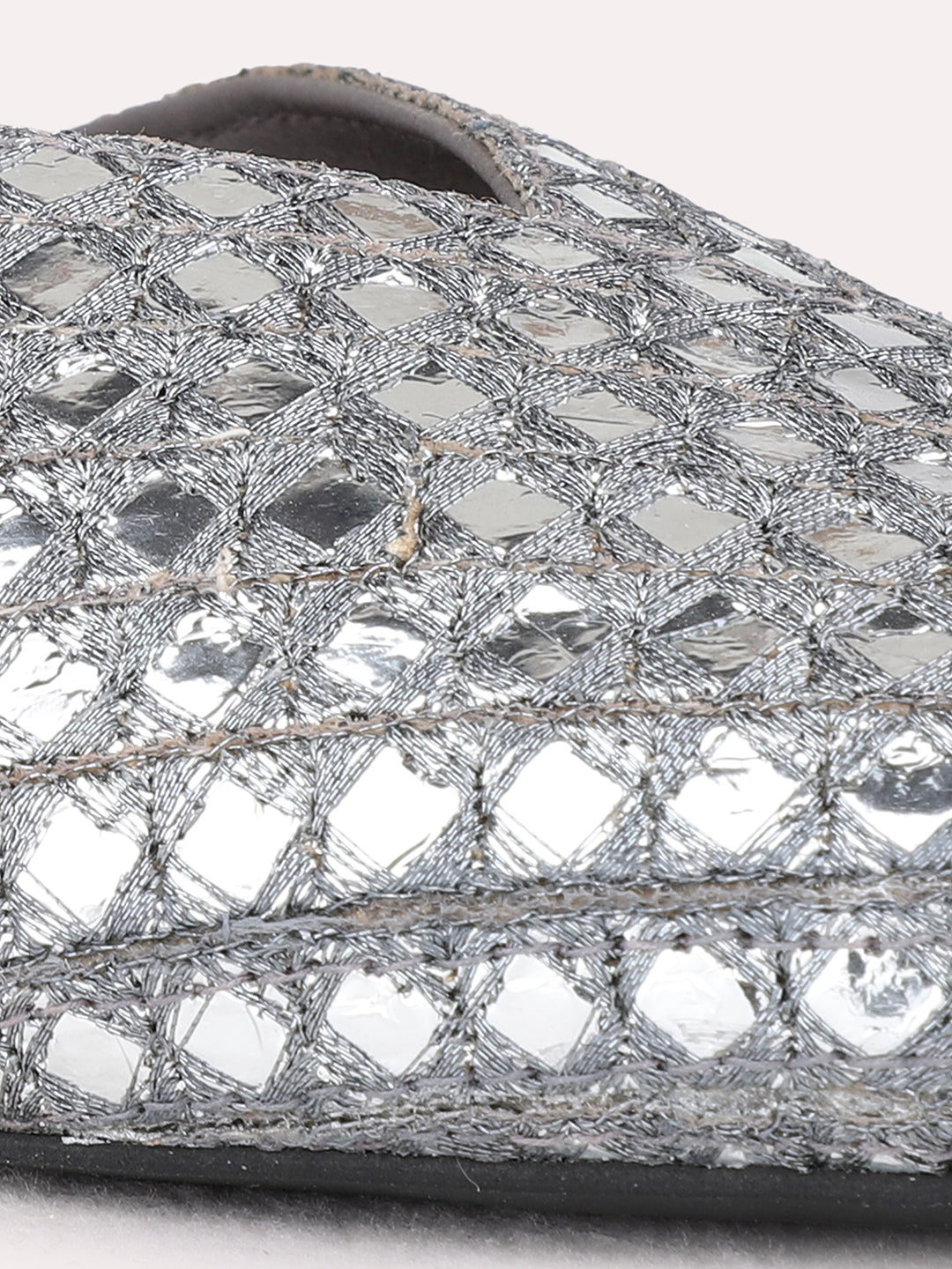 Product description:-Add glamour to tradition with pewter embellished block heel mules. Featuring a round toe and slip-on ease, they blend ethnic beauty with a modern, festive finish. |