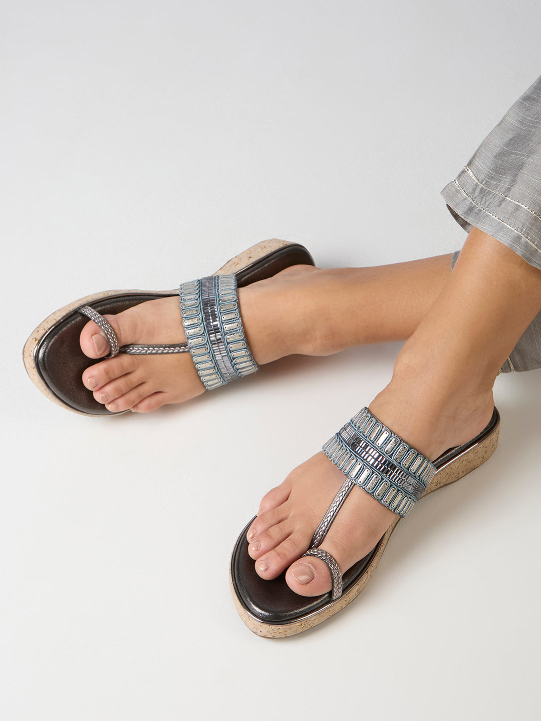 Product description:-Pewter wedge heel sandals with round toes and embellishments offer a festive and elegant style. Perfect for weddings, parties, and special occasions with lasting comfort. |