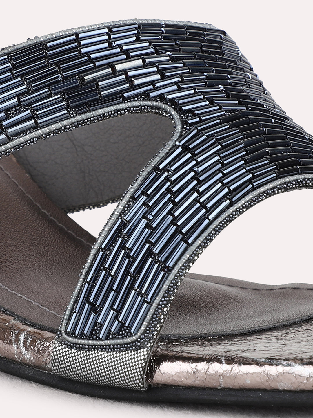 Womens Pewter Party Wear Embellished Square Toe Block Heel Sandals