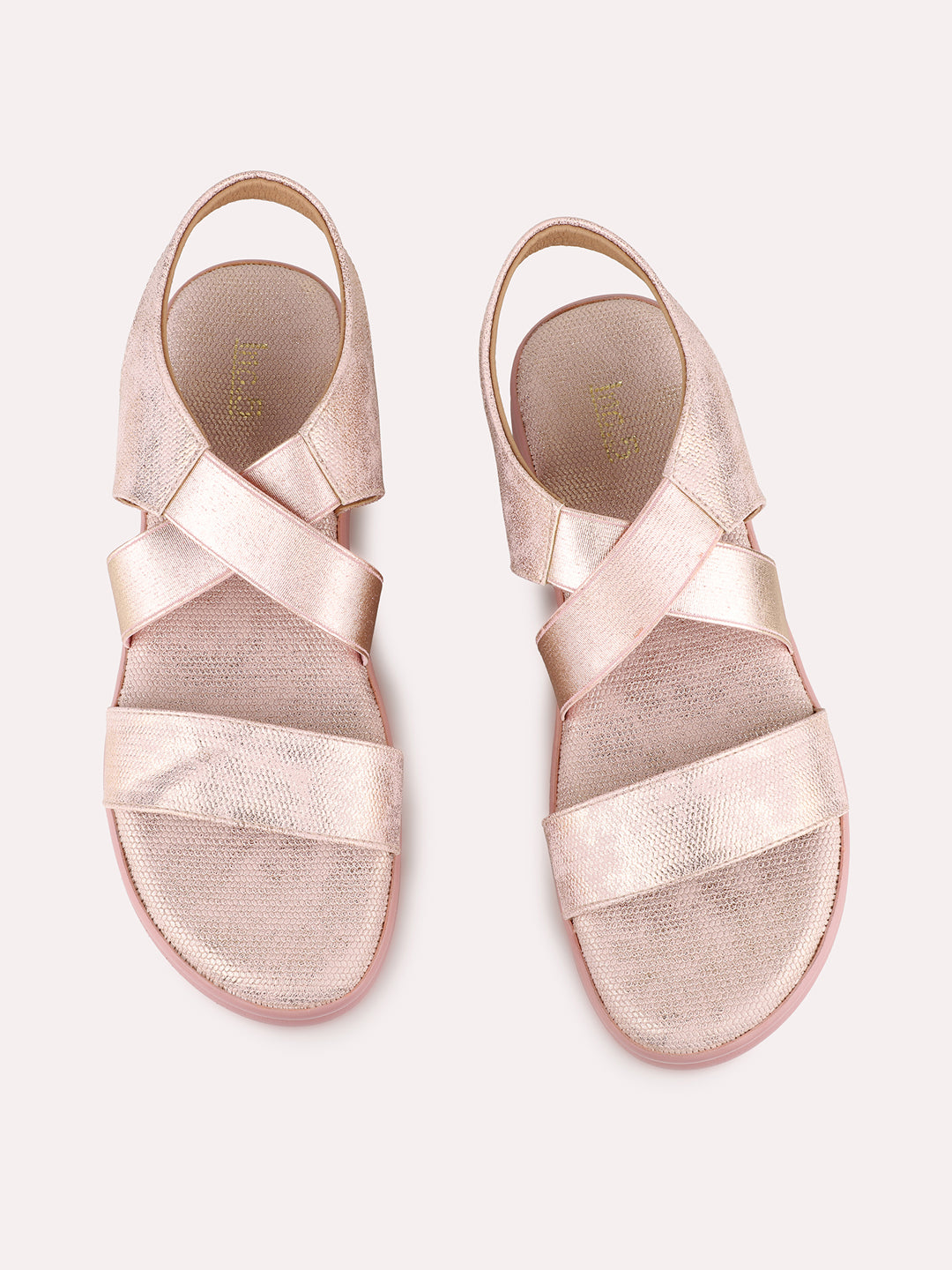 Product description:-These lovely Rose Gold striped flat sandals add soft metallic glamour to your casual attire. The open toe and flat design ensure all-day comfort with a feminine touch. |