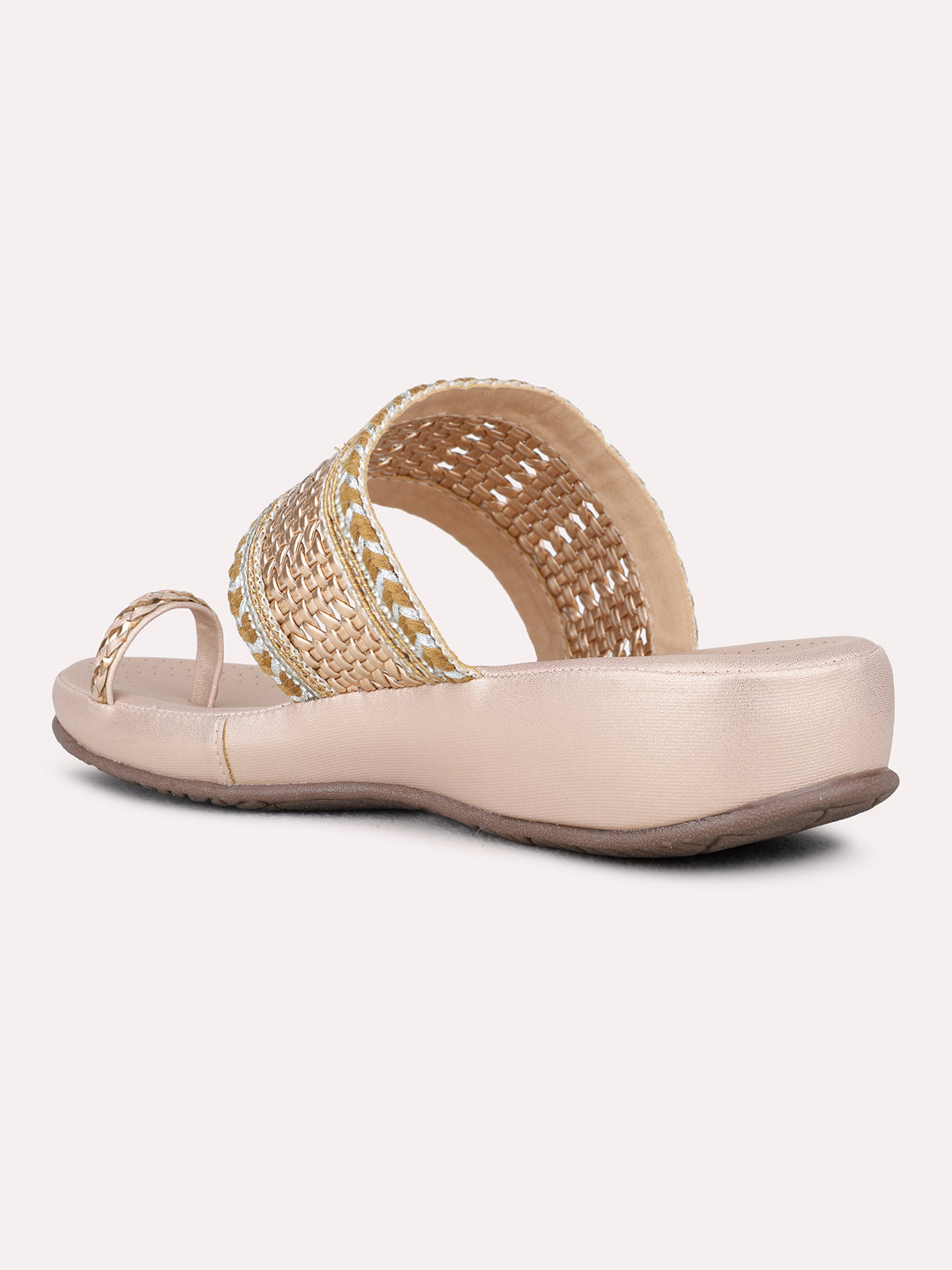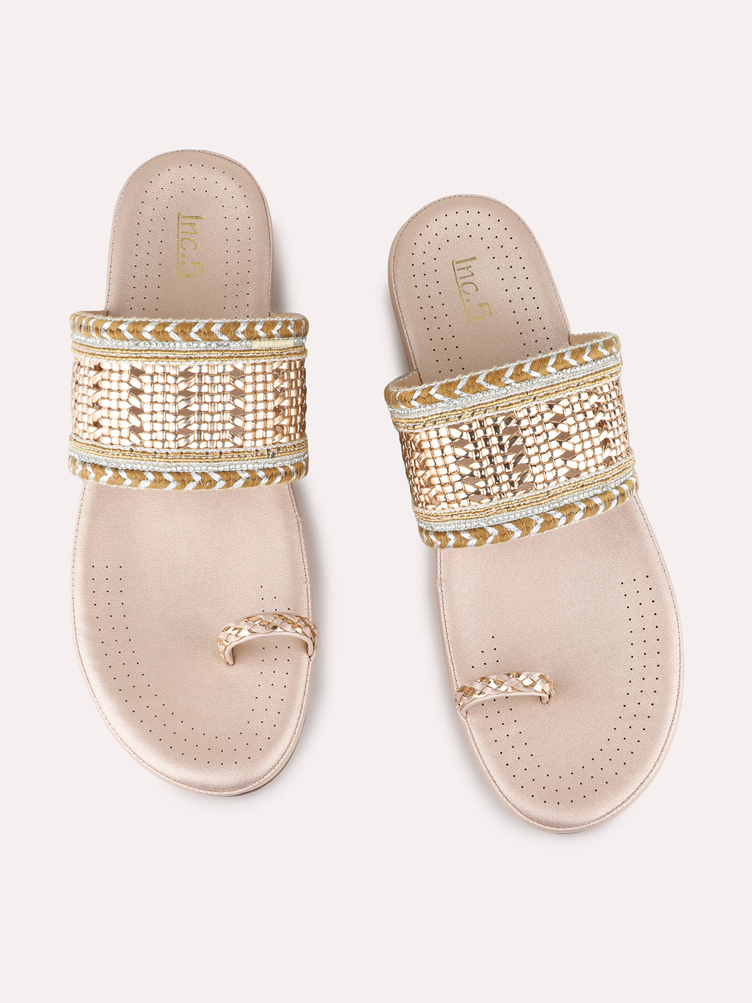 Product description:-Rose gold embellished one-toe slip-ons combine glamour and comfort. Ideal for parties, festive occasions, or casual celebrations, adding a chic metallic touch. |