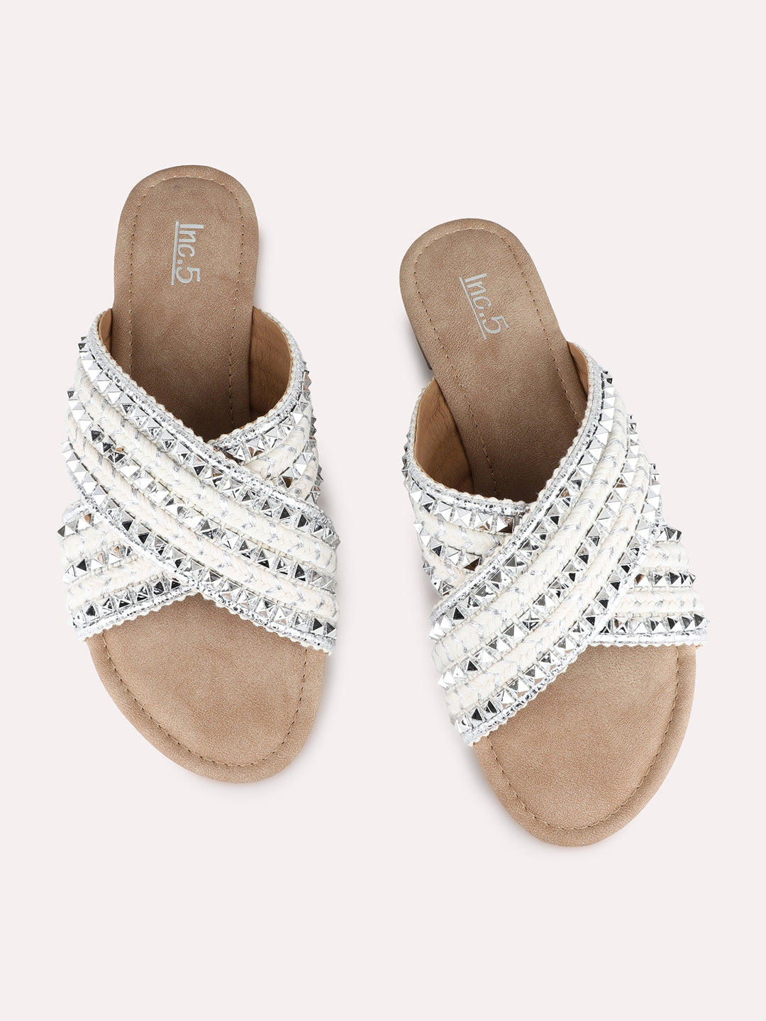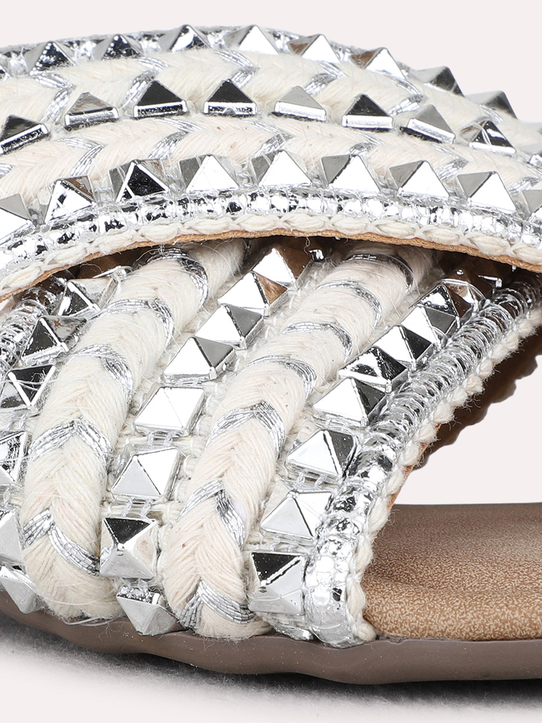 Product description:-Silver embellished open-toe flat slip-ons provide sparkle and comfort for parties. Perfect for weddings, festive events, or evening celebrations. |